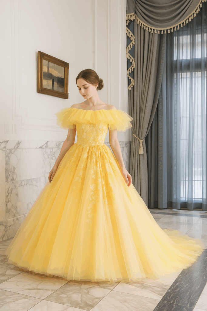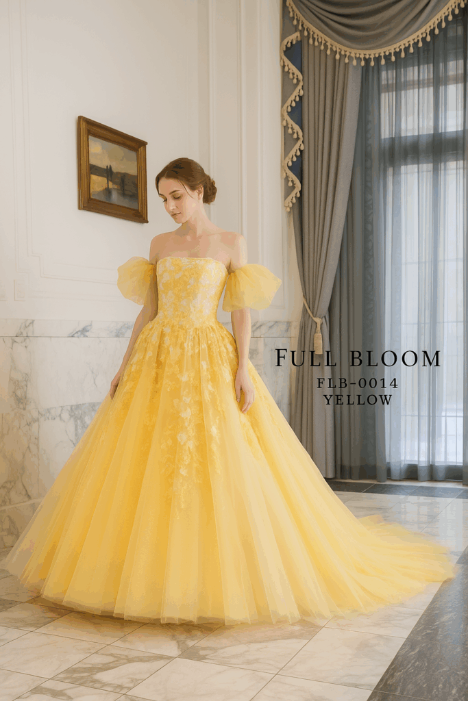 お写真にもしっかりと映る鮮やかなイエローカラーのチュールドレス。 身ごろからスカート部分にあしらわれたフラワーレースはグラデーションになっているため立体感を感じます。全体にスパンコールが散りばめられているので光を集めて美しく輝きます。 ビスチェ、オフショルダー2種の3WAY仕様。