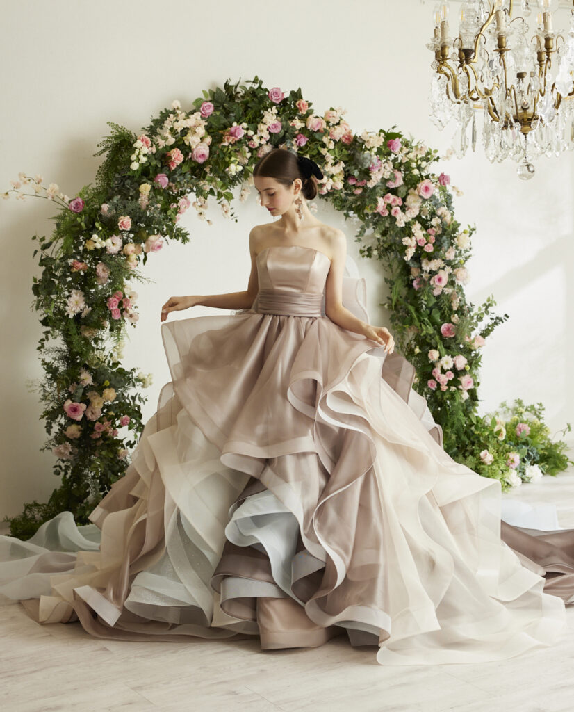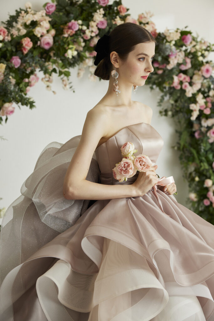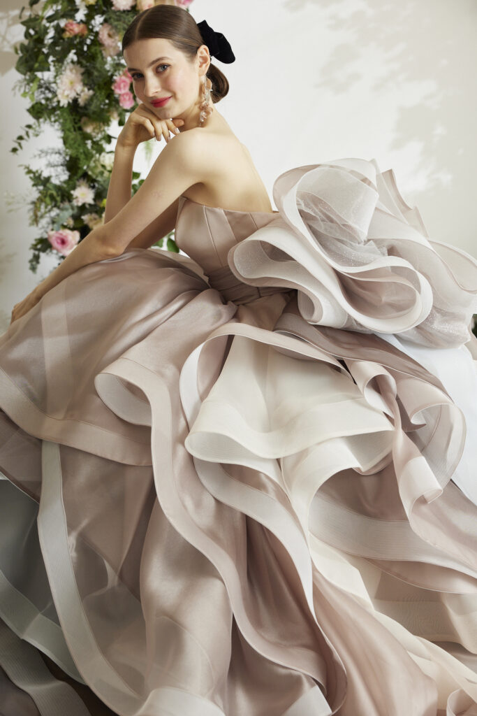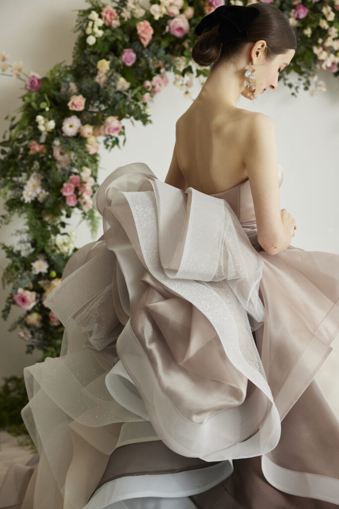 ミニマルな上半身と、ドラマチックに広がるティアードスカートの対比が、挙式・披露宴・フォトウェディングなど、あらゆるシーンで圧倒的な存在感を放ちます。