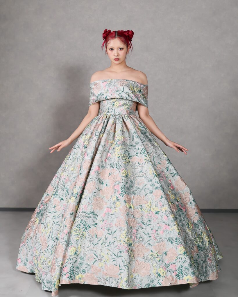 立体感のあるジャカード生地に色鮮やかなフラワーモチーフを散りばめた、アーティスティックな1着。オフショルダーのデザインがデコルテを美しく魅せ、クラシカルな気品とモード感を同時に演出します。光の加減で柄が浮かび上がり、角度によって異なる表情を楽しめるのも魅力。存在感あふれるシルエットは、披露宴のお色直しやフォトウェディングでゲストの視線を惹きつけます。