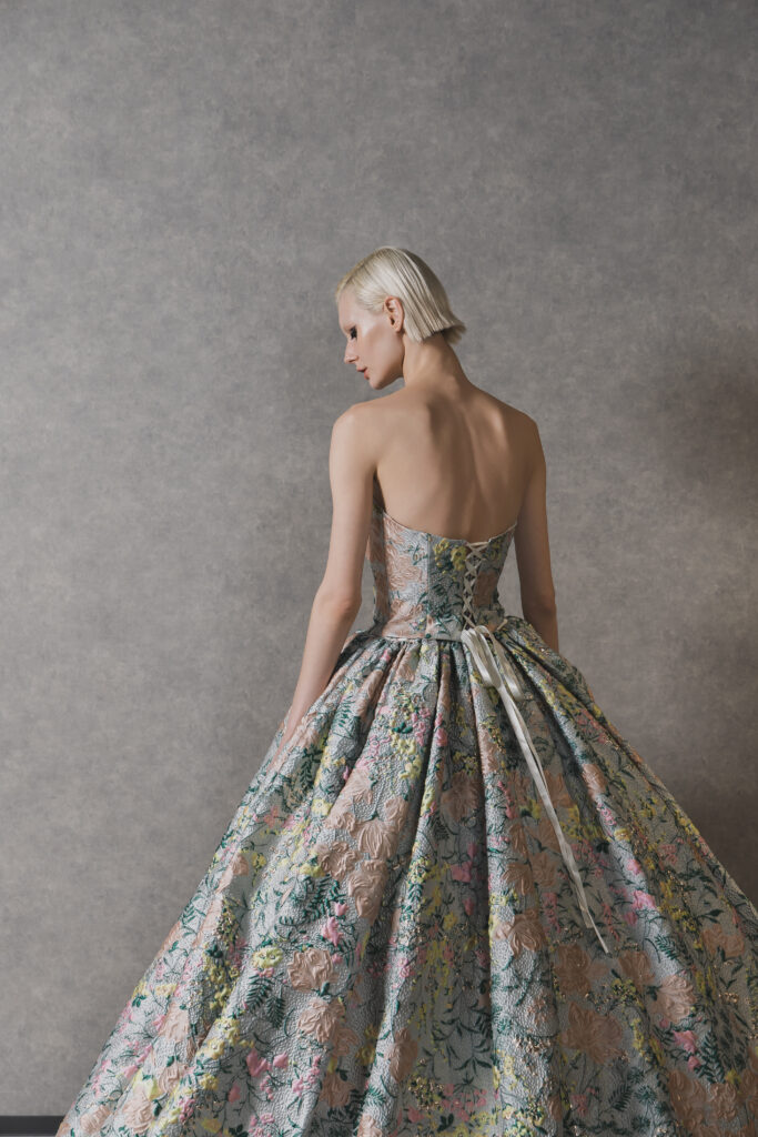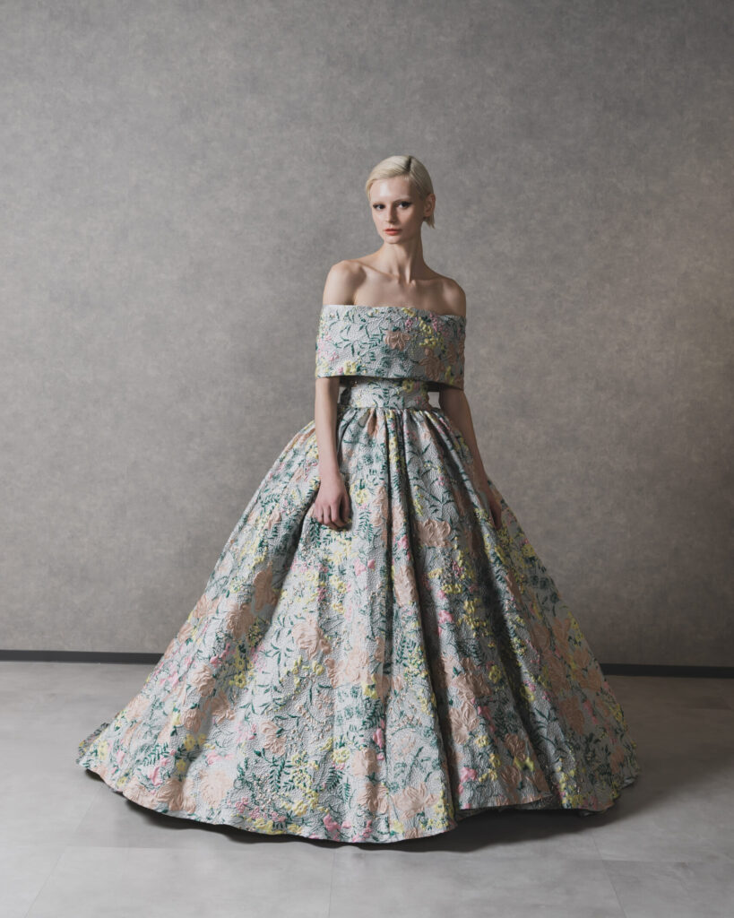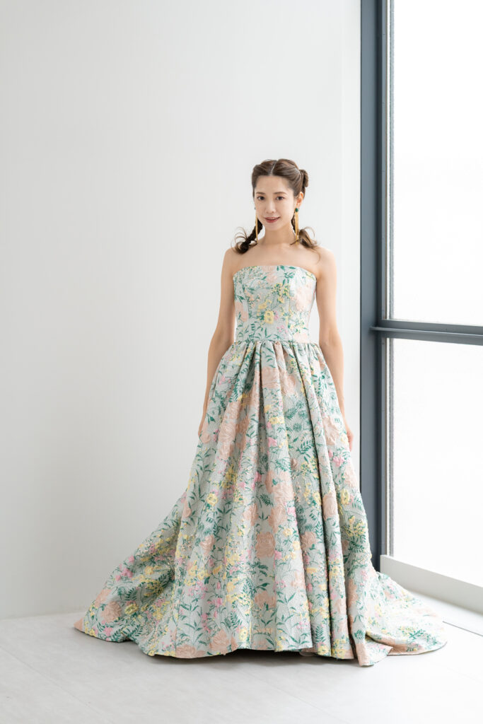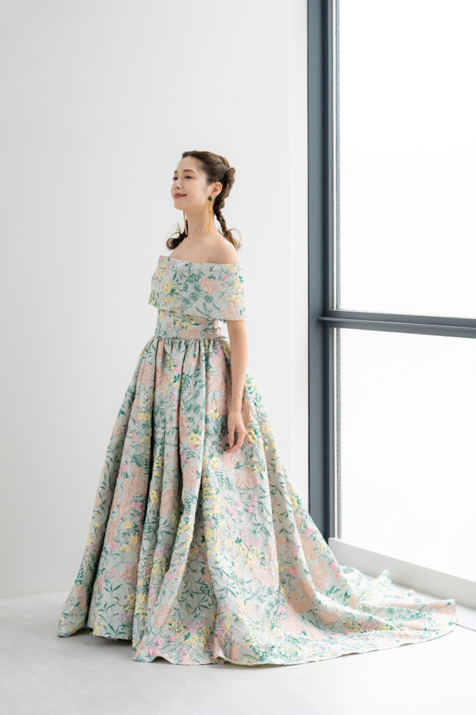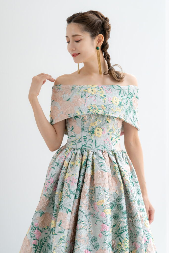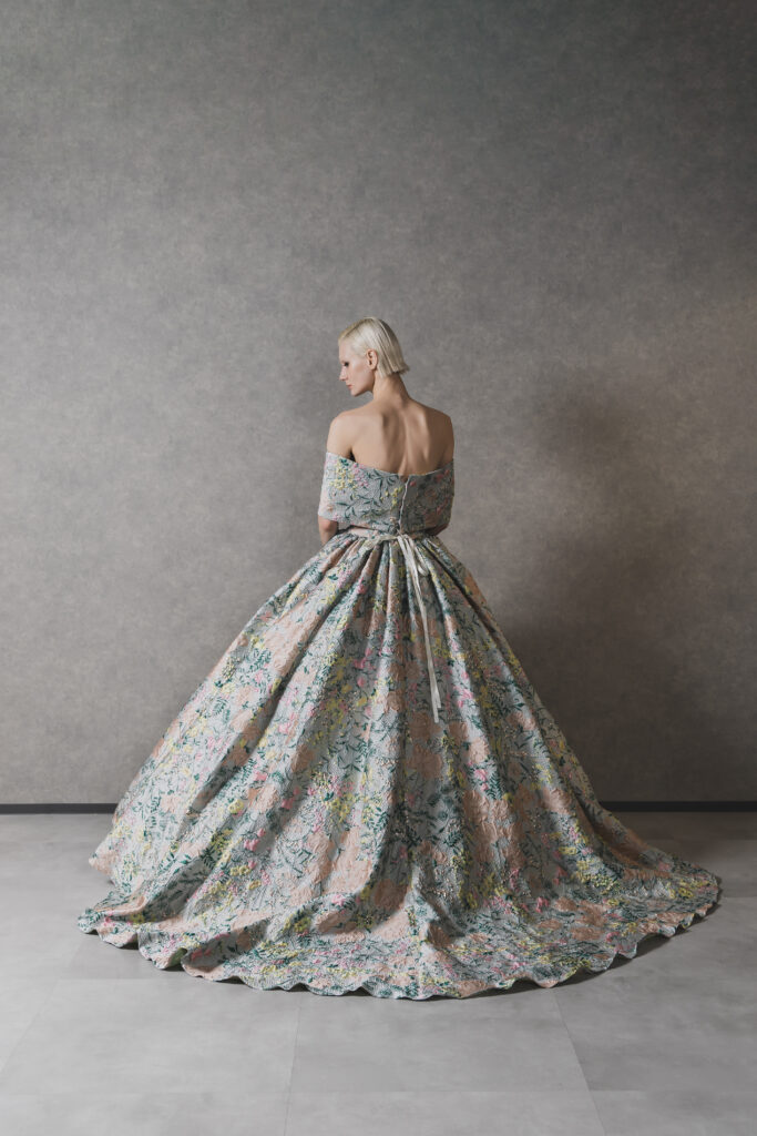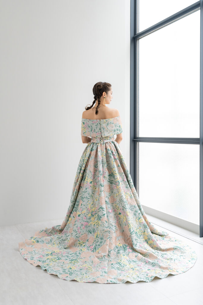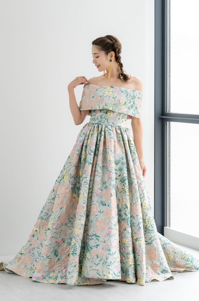 立体感のあるジャカード生地に色鮮やかなフラワーモチーフを散りばめた、アーティスティックな1着。オフショルダーのデザインがデコルテを美しく魅せ、クラシカルな気品とモード感を同時に演出します。光の加減で柄が浮かび上がり、角度によって異なる表情を楽しめるのも魅力。存在感あふれるシルエットは、披露宴のお色直しやフォトウェディングでゲストの視線を惹きつけます。