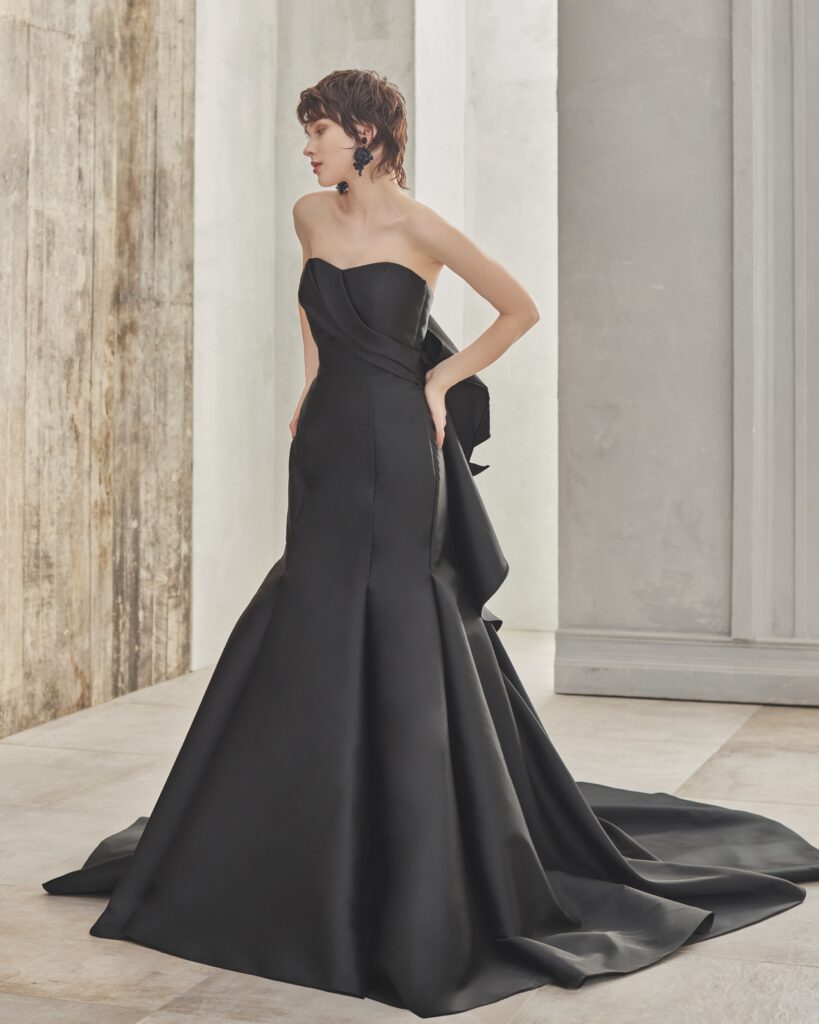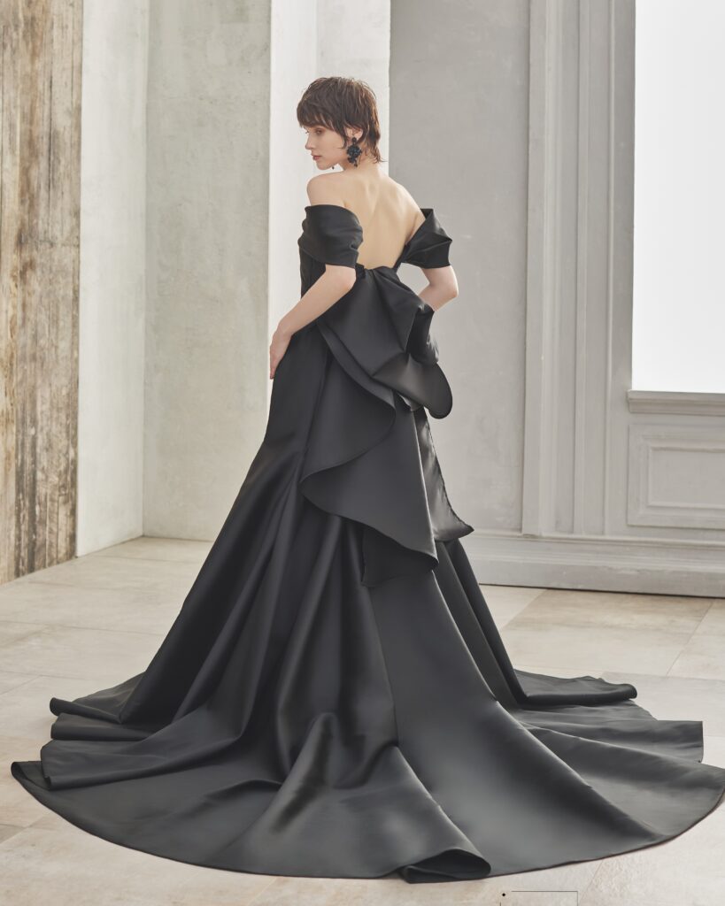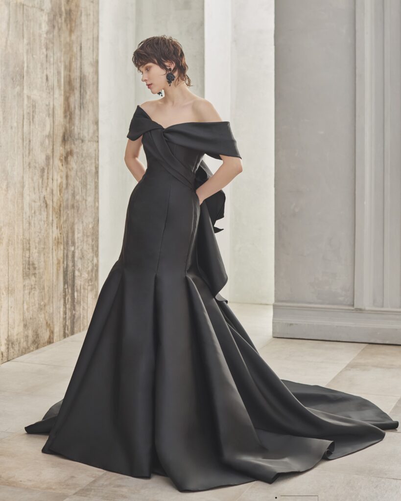 深いブラックが放つ静かな迫力と、立体的なオフショルダーのラインが印象的なマーメイドドレス。