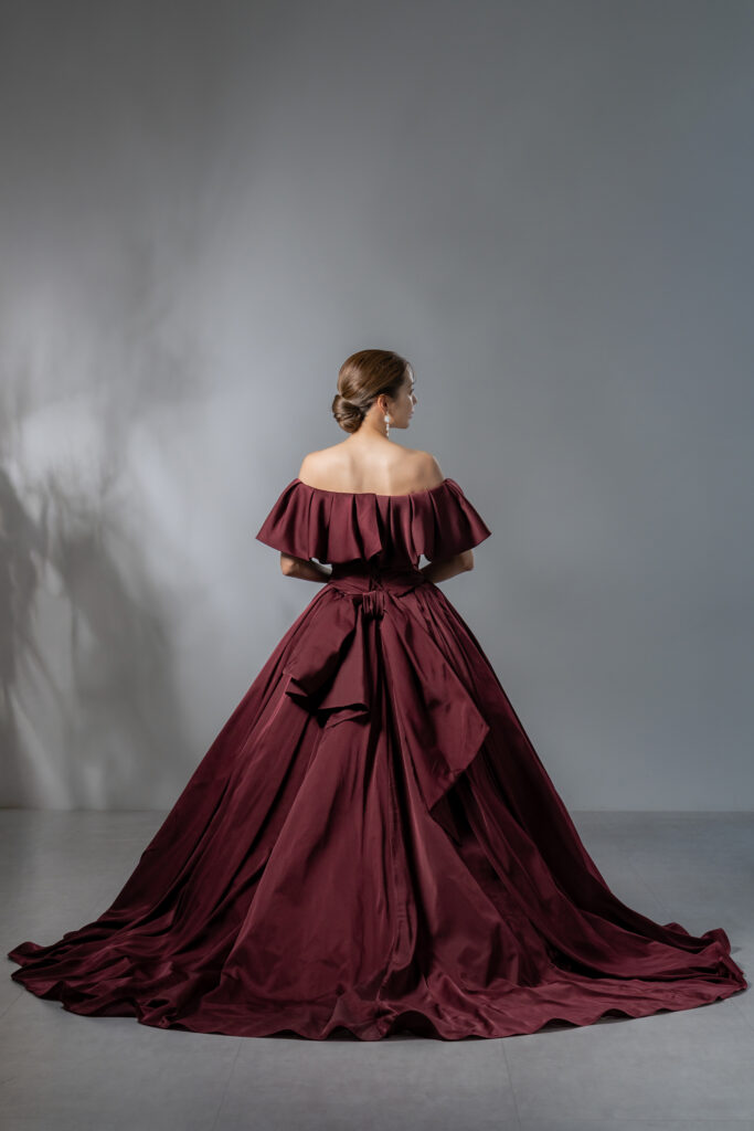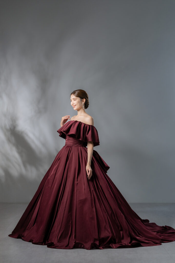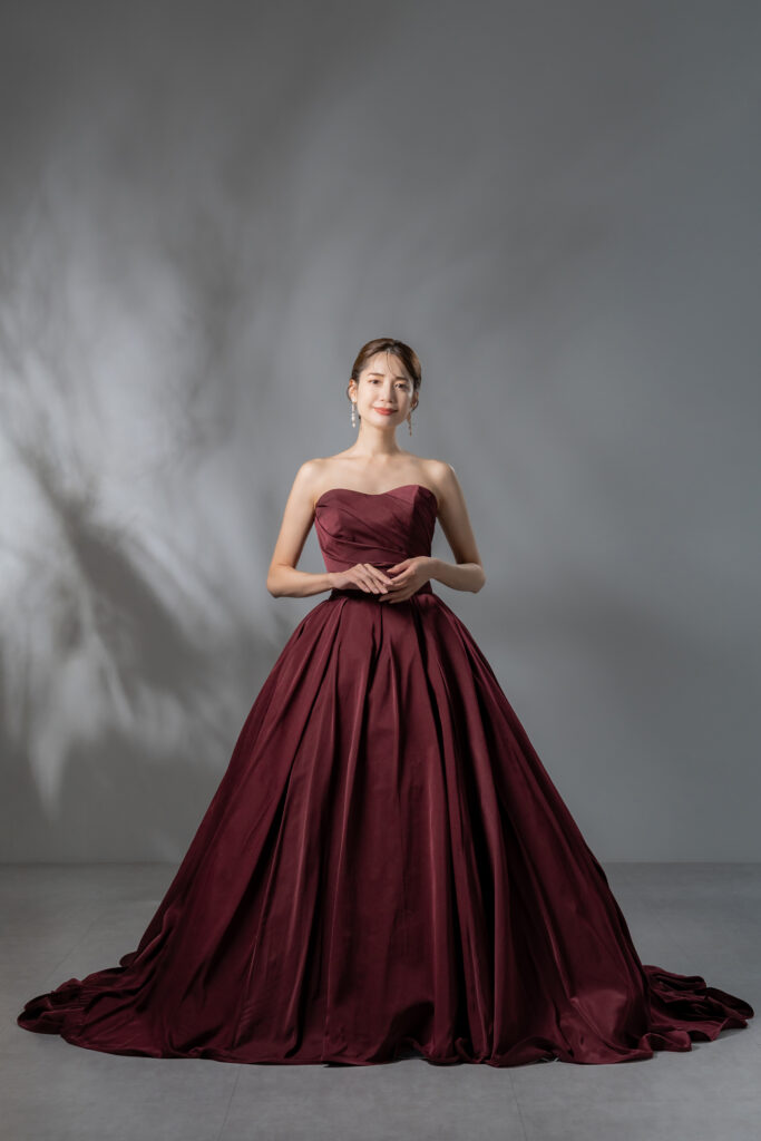 深みのあるボルドーが放つ圧倒的な気品と、計算されたシルエットが美しいプリンセスラインのカラードレス。 滑らかな光沢を湛えた上質なサテン生地が、動くたびにドラマティックな陰影を描き出し、主役にふさわしい存在感を放ちます。