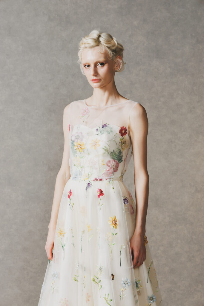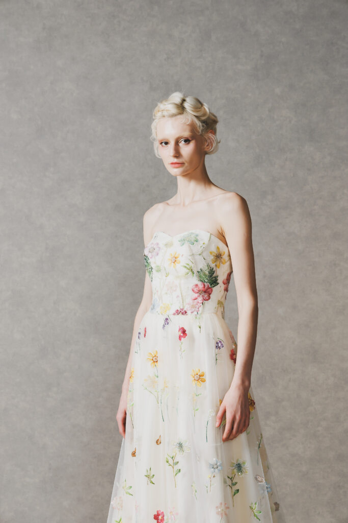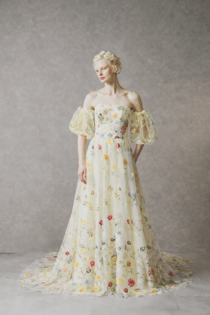色とりどりのボタニカル刺繍がドレス全体に咲き誇る、インポートライクで可憐なプリンセスドレス。イエローの柔らかなチュールに、精密なマルチカラーの刺繍を施すことで、ナチュラルさと華やかさを完璧に両立させた一着です。二の腕をふんわりカバーするパフスリーブを合わせれば、トレンド感溢れるスウィートな印象に。また、デコルテを優しく覆うチュールのシアーブラウスを纏えば、一転して上品でクラシカルな雰囲気を演出します。さらに、刺繍の美しさが最も際立つシンプルなビスチェスタイルなら、すっきりと大人っぽい表情へと導きます。