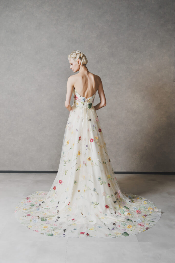 バックスタイルには優美なトレーンが広がり、360°どこから見ても絵画のような美しさ。ガーデンウェディングはもちろん、レストランウェディングなどにも相性が良く、遊び心あふれるデザインです。