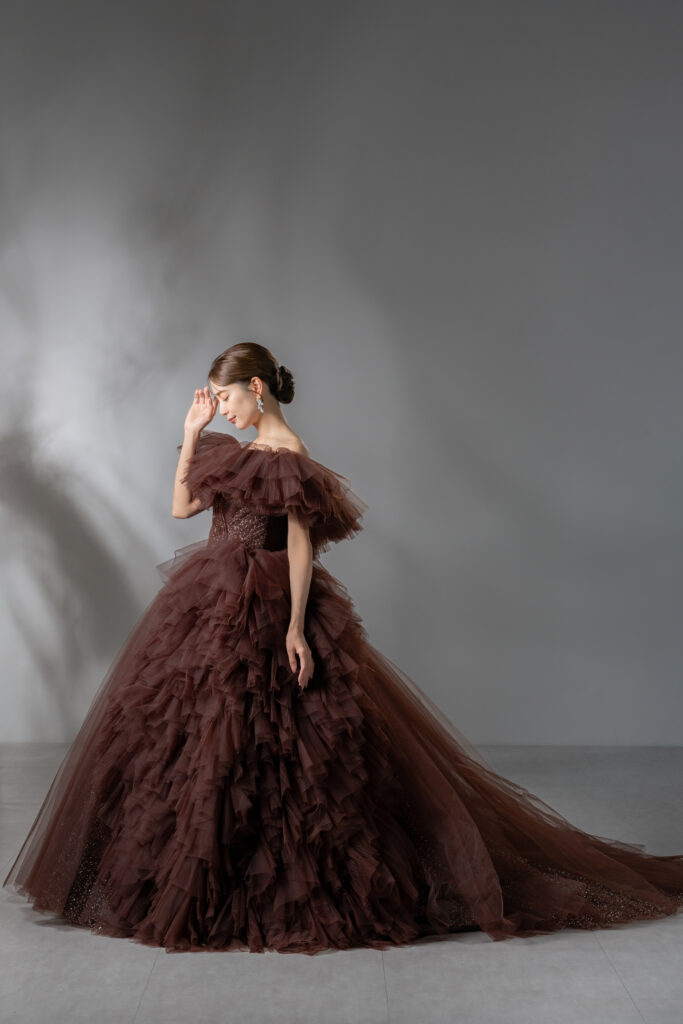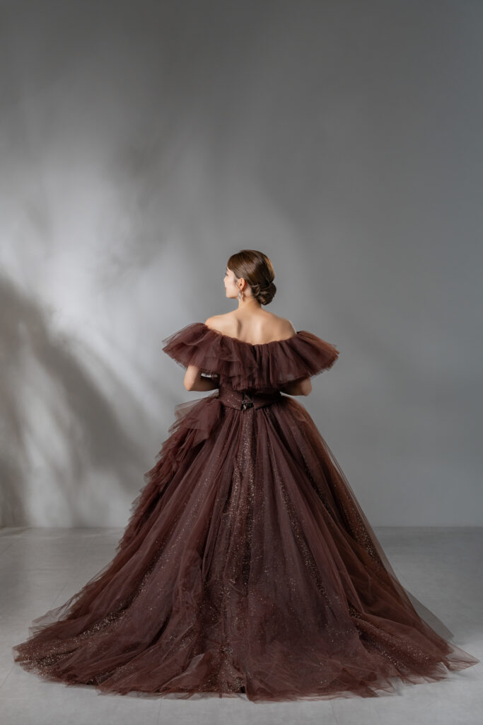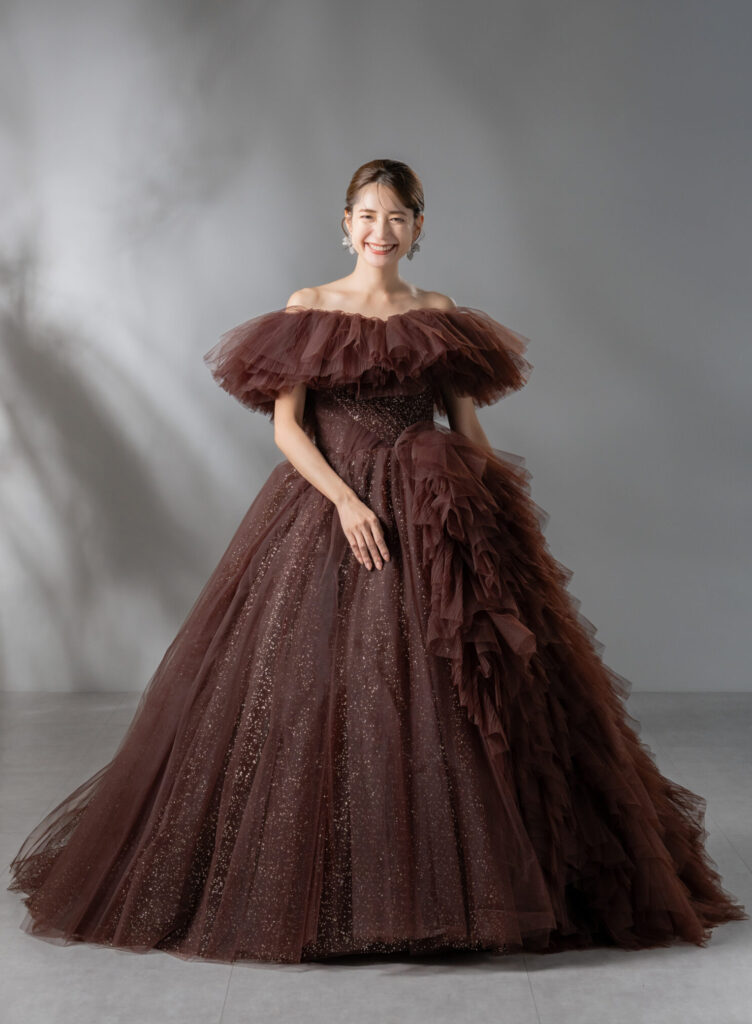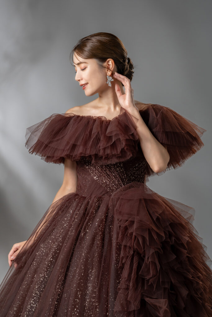 こちらのドレスは、3種類の異なるデザインから形・カラー・グリッターを組み合わせ、Unis.花嫁様にご満足いただけるようこだわり抜いたオリジナルデザインです。シックなブラウンカラーに、シルバーとゴールドをミックスした繊細なラメを全体に散りばめ、絶妙な輝きを表現しました。オフショルダーに加え、サイドにあしらわれた立体的なフリルと、贅沢に生地を使用したビッグシルエットが華やかさと存在感を際立たせます。フリル・オフショルダーはどちらも取り外し可能なため、すっきりとしたシルエットと華やかなデザイン、2つのスタイルを自由に楽しめます。