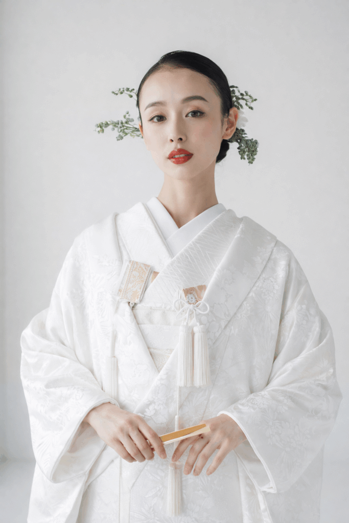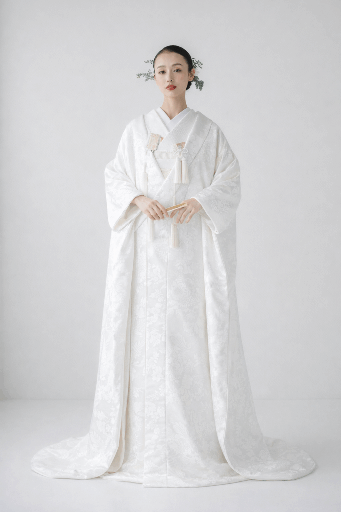 ミニマルな白一色の世界の中に、織りによるドラマチックなディテールを盛り込み、厳かな神前挙式からフォトウェディングまで、あらゆる和装のシーンで圧倒的な存在感を放ちます。