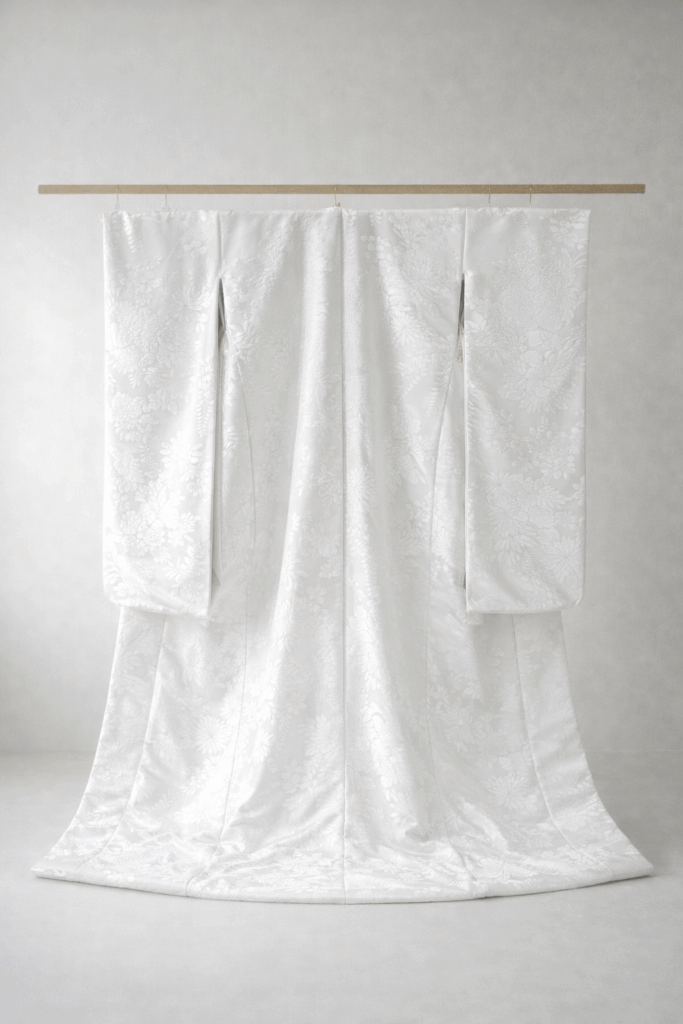 洗練された純白の生地が花嫁の表情を明るく際立たせる、エレガントな白無垢。丹念に織り上げられた地模様には、富貴の象徴である牡丹や気品漂う菊など、おめでたい「吉祥文様」が贅沢に配されています。