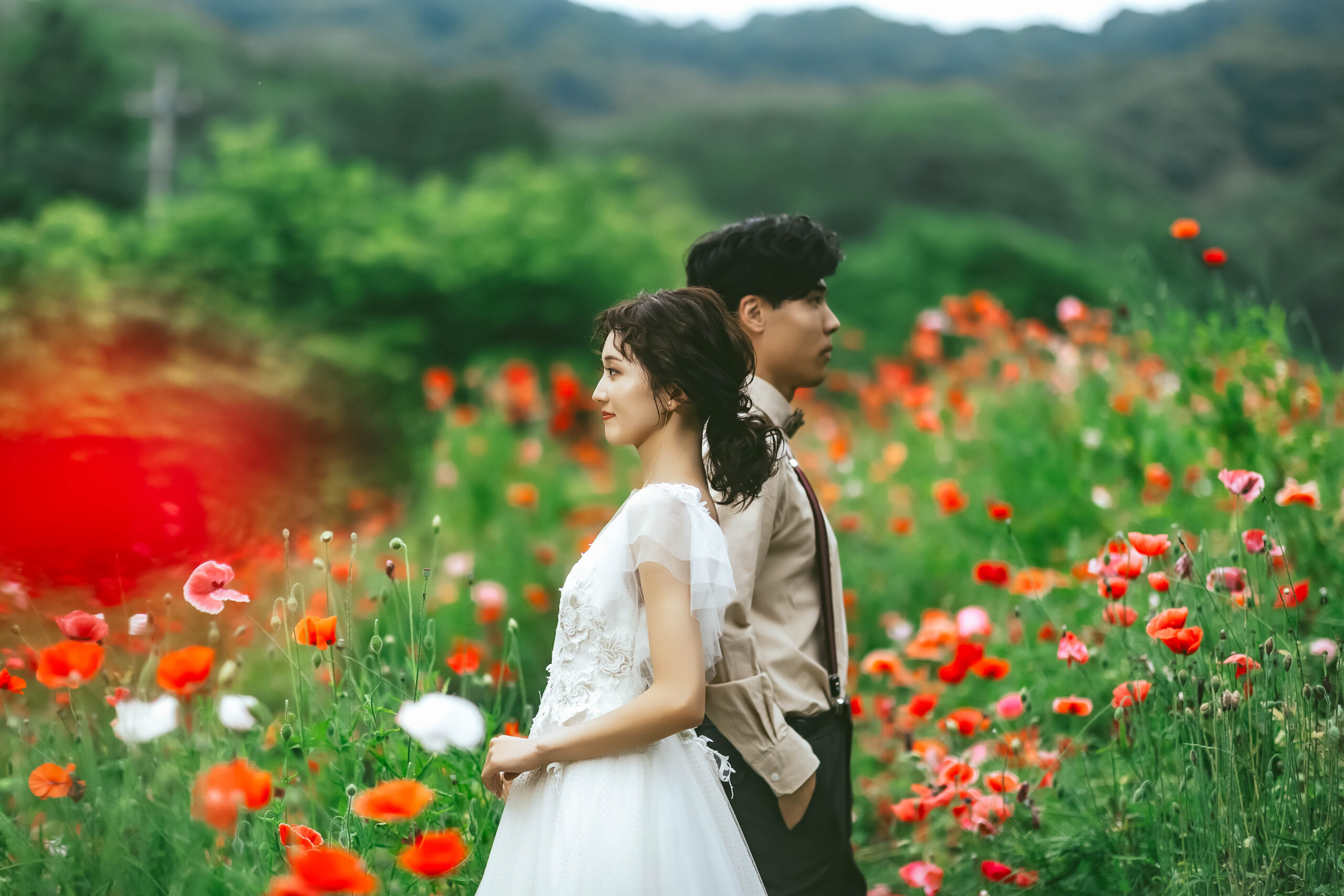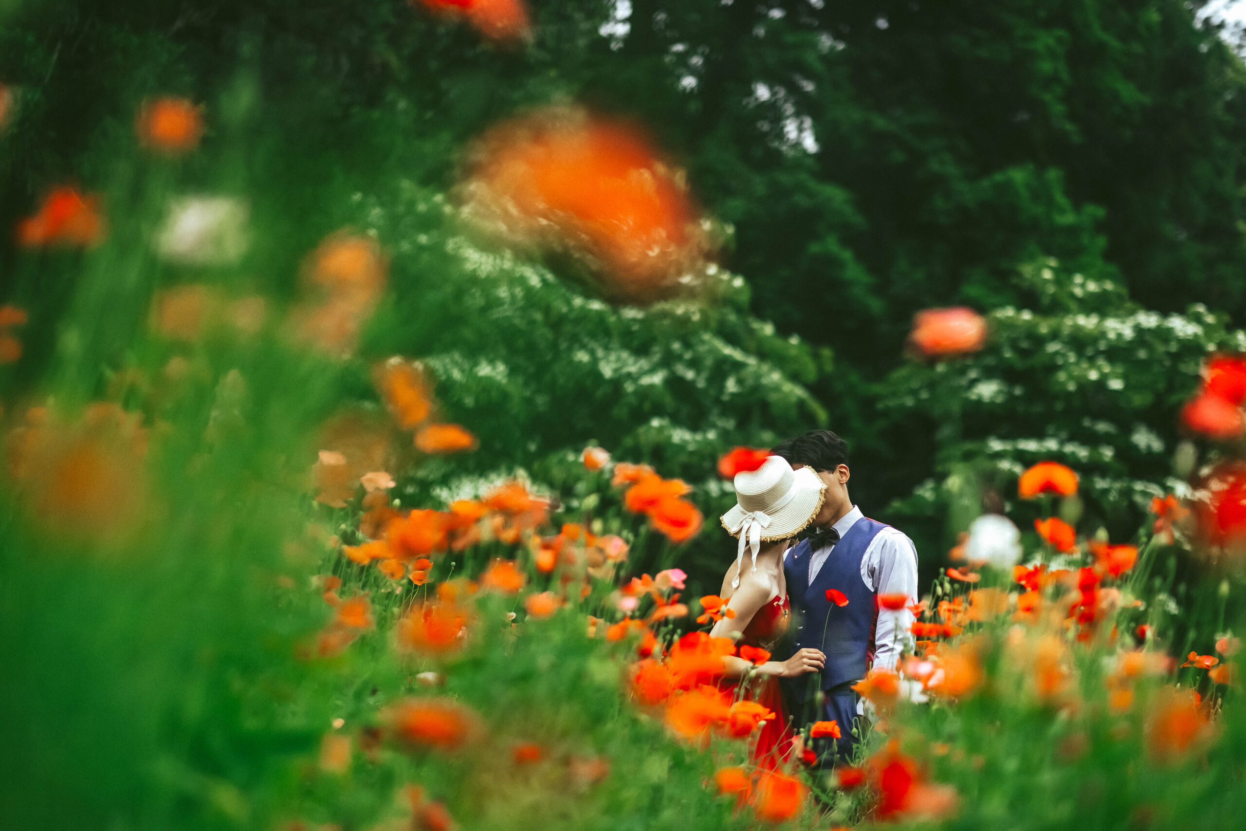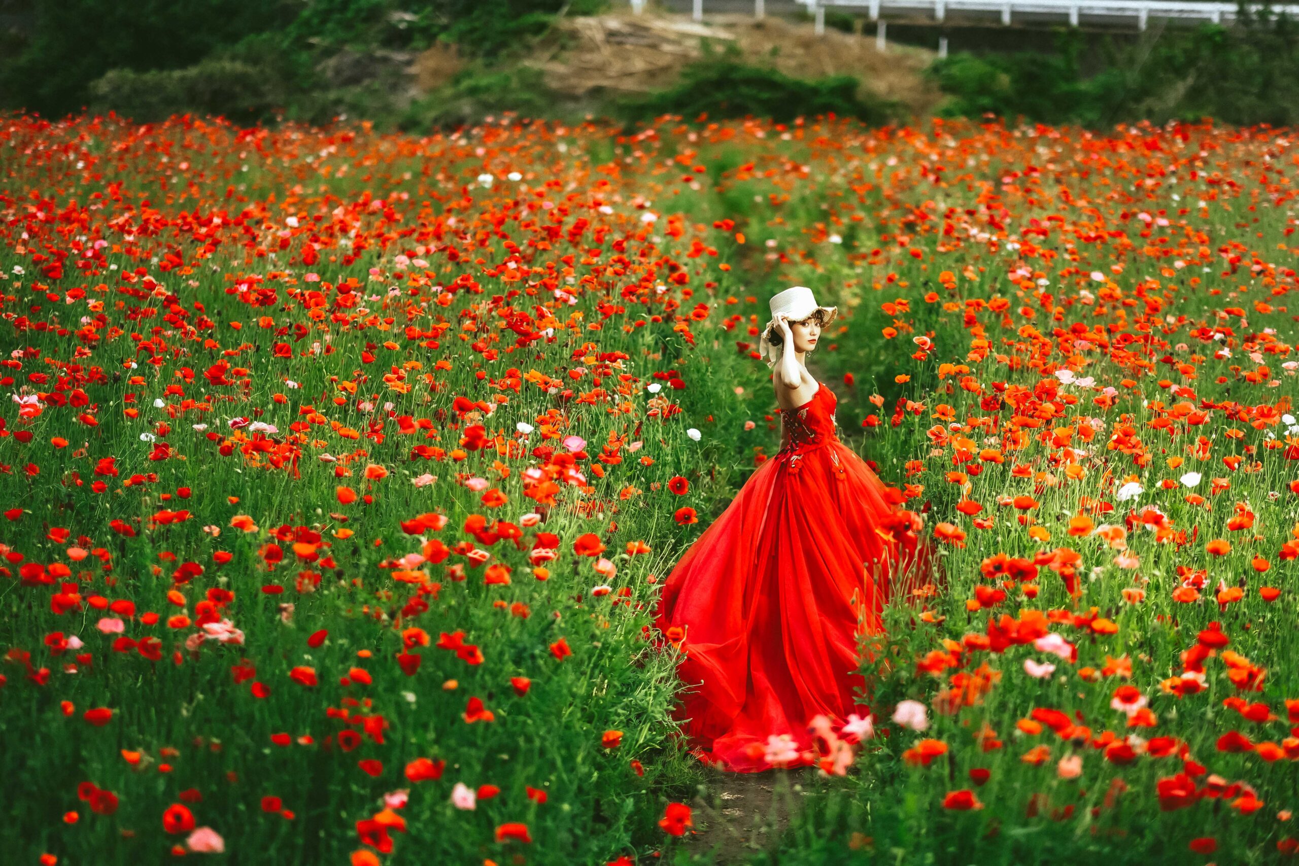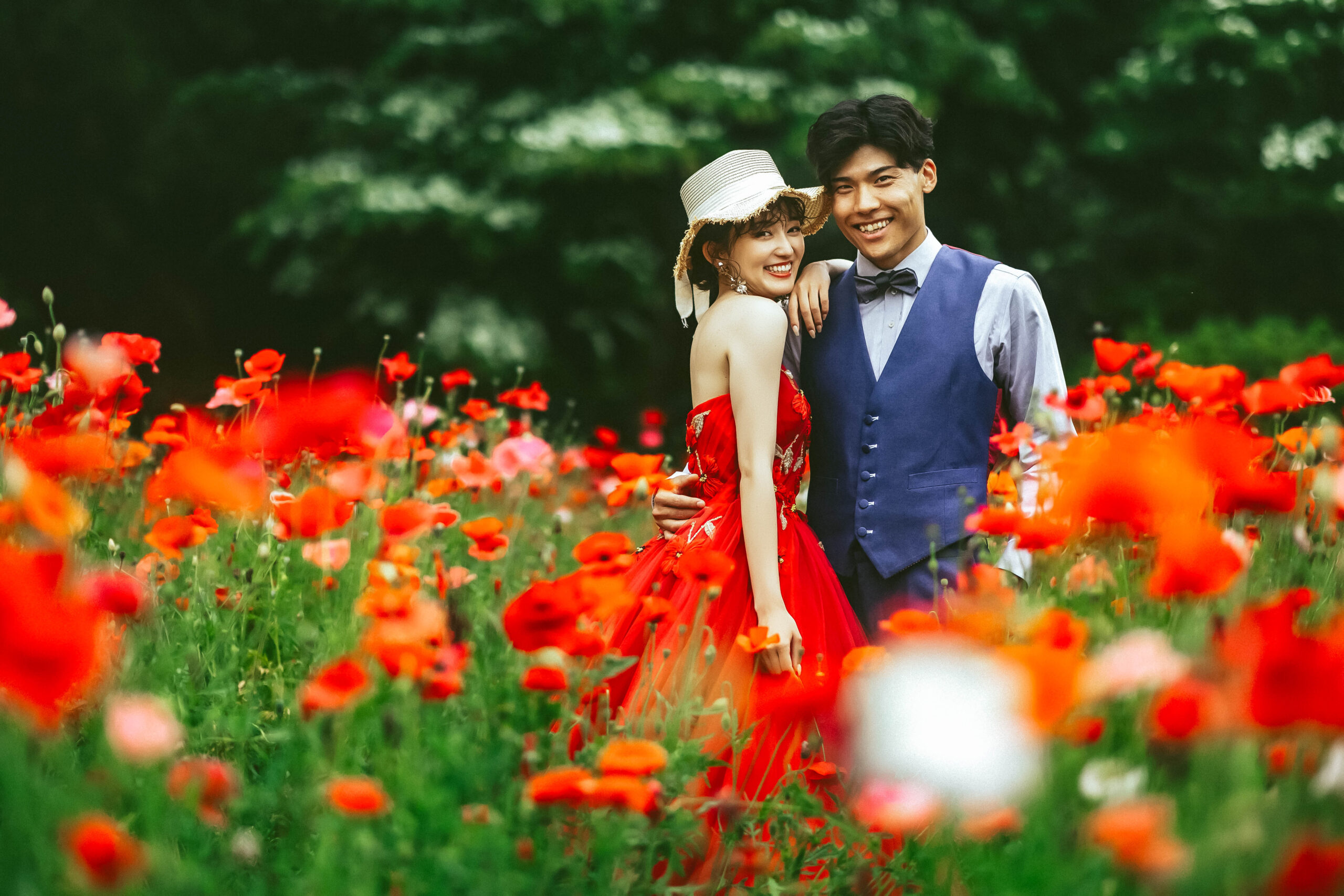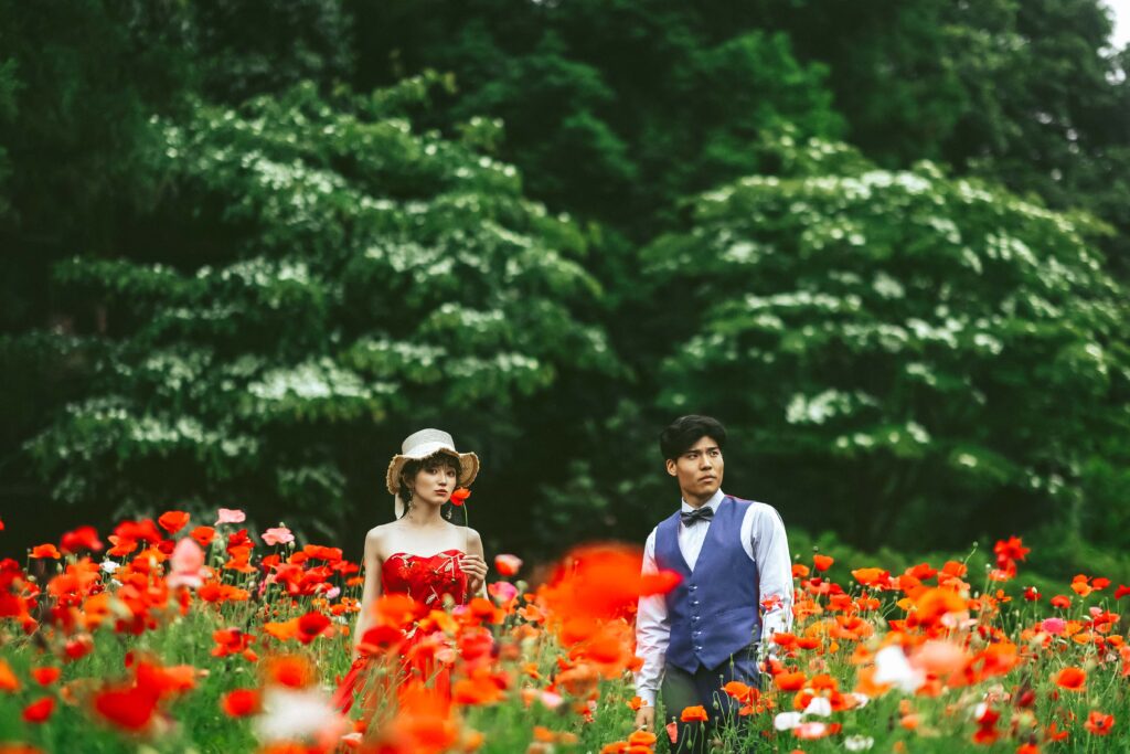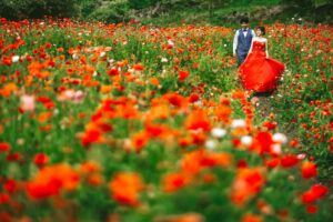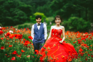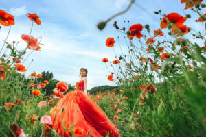 一面に咲き誇るポピーは、可憐でありながら力強く、見る人の心をふっと軽くしてくれます。赤・ピンク・白の花々が織りなす景色は、華やかさの中にどこか素朴で、自然体の美しさを引き立ててくれるロケーション。