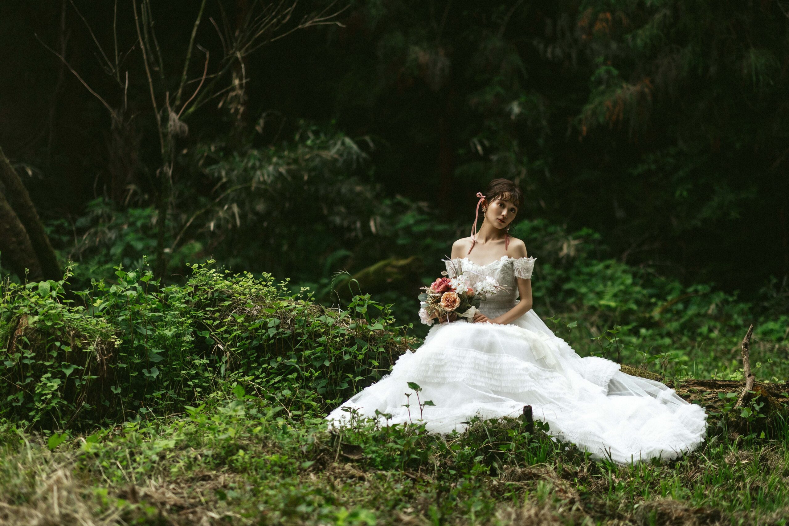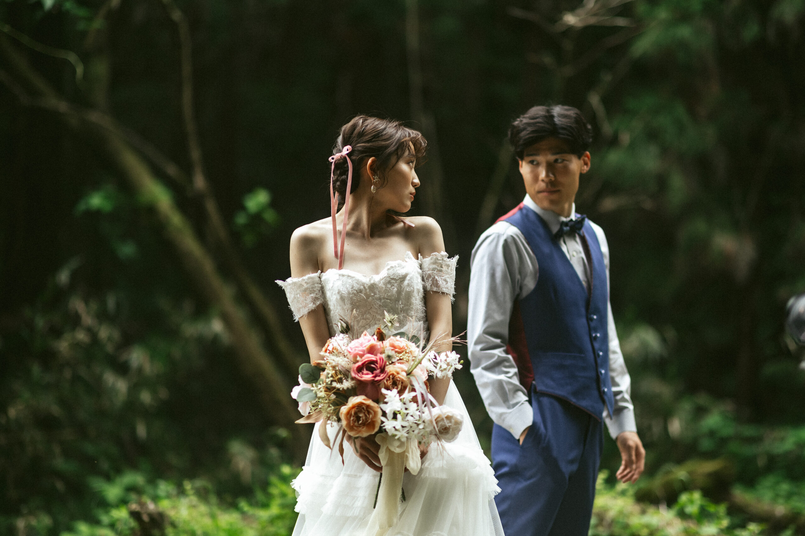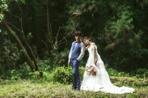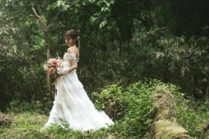 木々の間を抜けるやわらかな光。深い緑の静けさに、そっと溶け込むふたりの姿。群馬県安中市の森は、自然そのものが舞台装置になるフォトウェディングロケーションです。