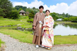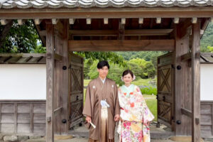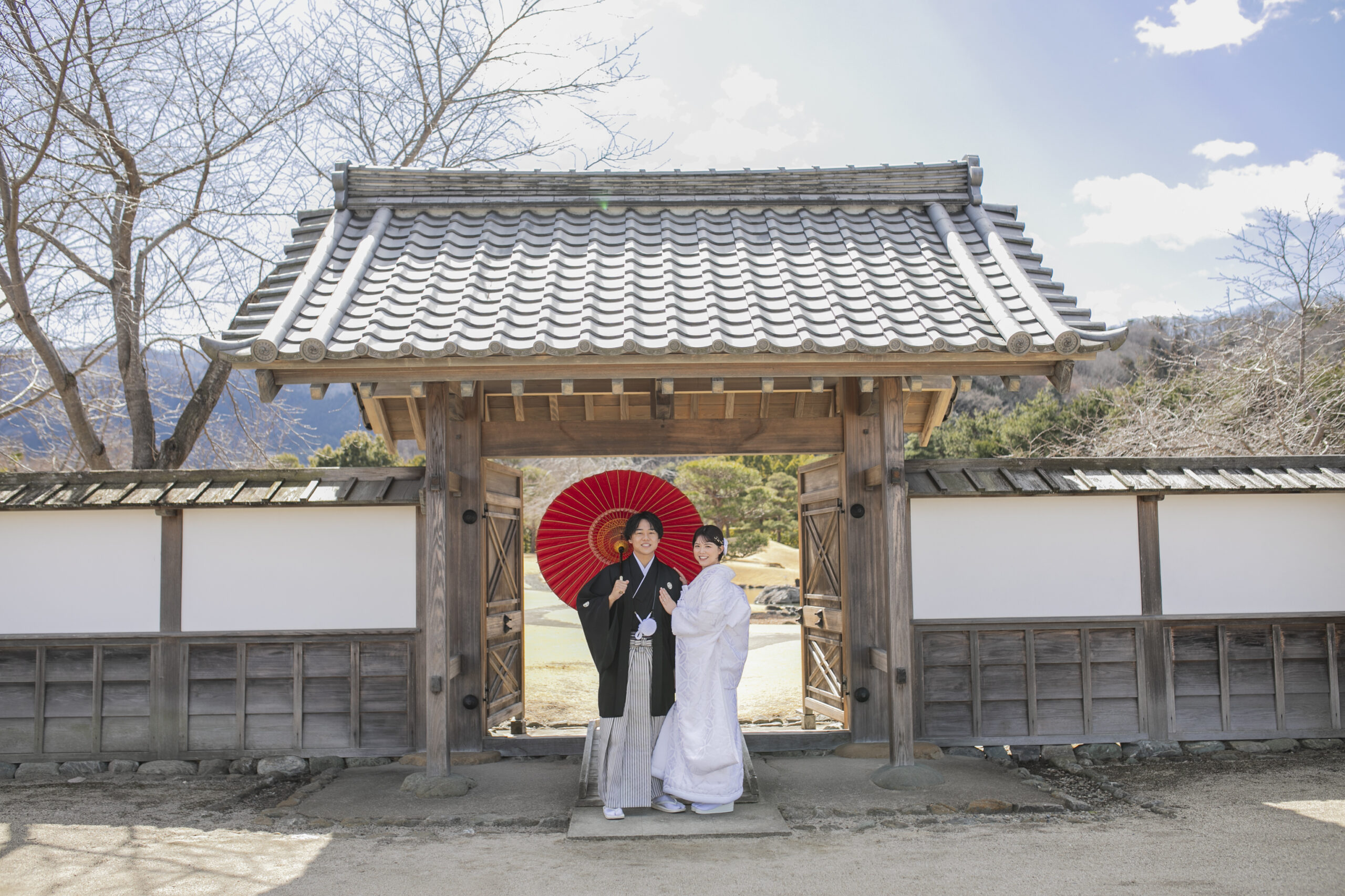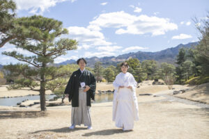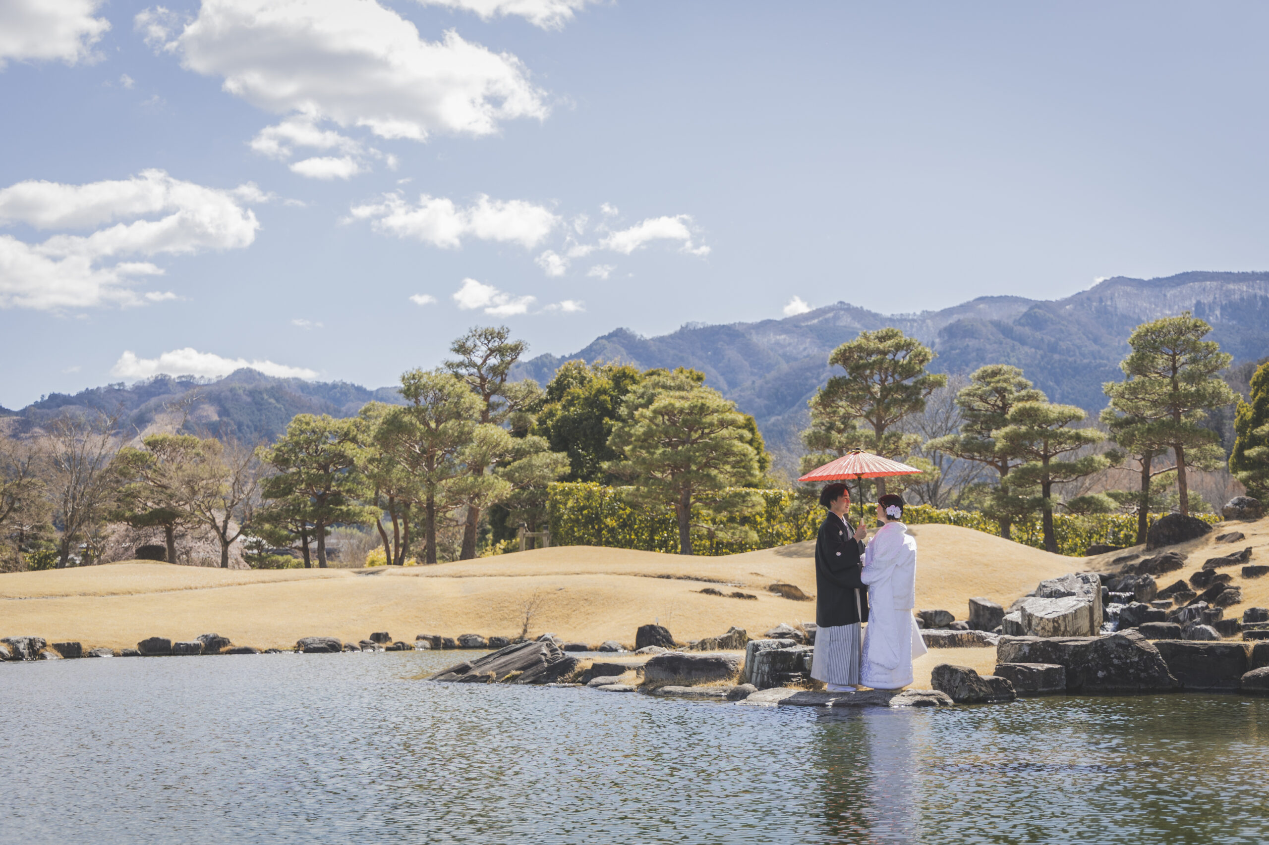 群馬県甘楽町に佇む「楽山園(らくさんえん)」は、江戸時代の風情を色濃く残す、国指定名勝の大名庭園。静けさに満ちた池泉回遊式の庭園と、美しく整えられた石畳、茶室、松の木々が織りなす景色は、まさに和の原風景。移ろいゆく季節とともに表情を変える庭園は、春の桜、夏の深緑、秋の紅葉、冬の静寂… どの季節も絵になります。白無垢や色打掛が映える、格式高いロケーションで、心に残る一枚を。