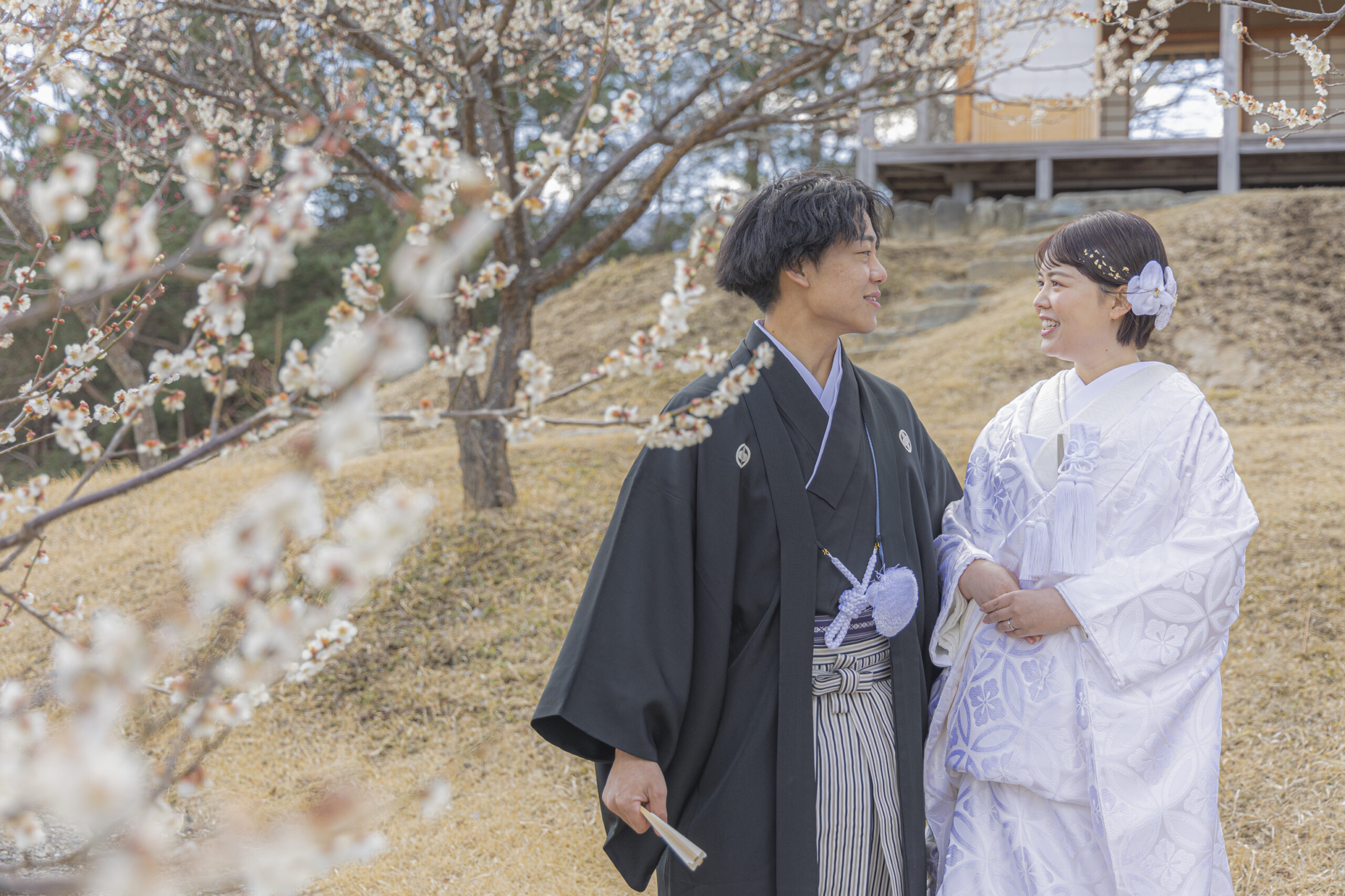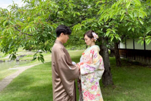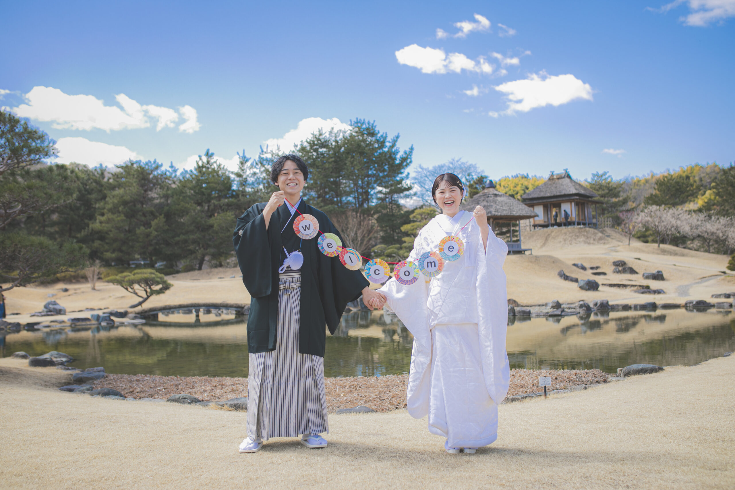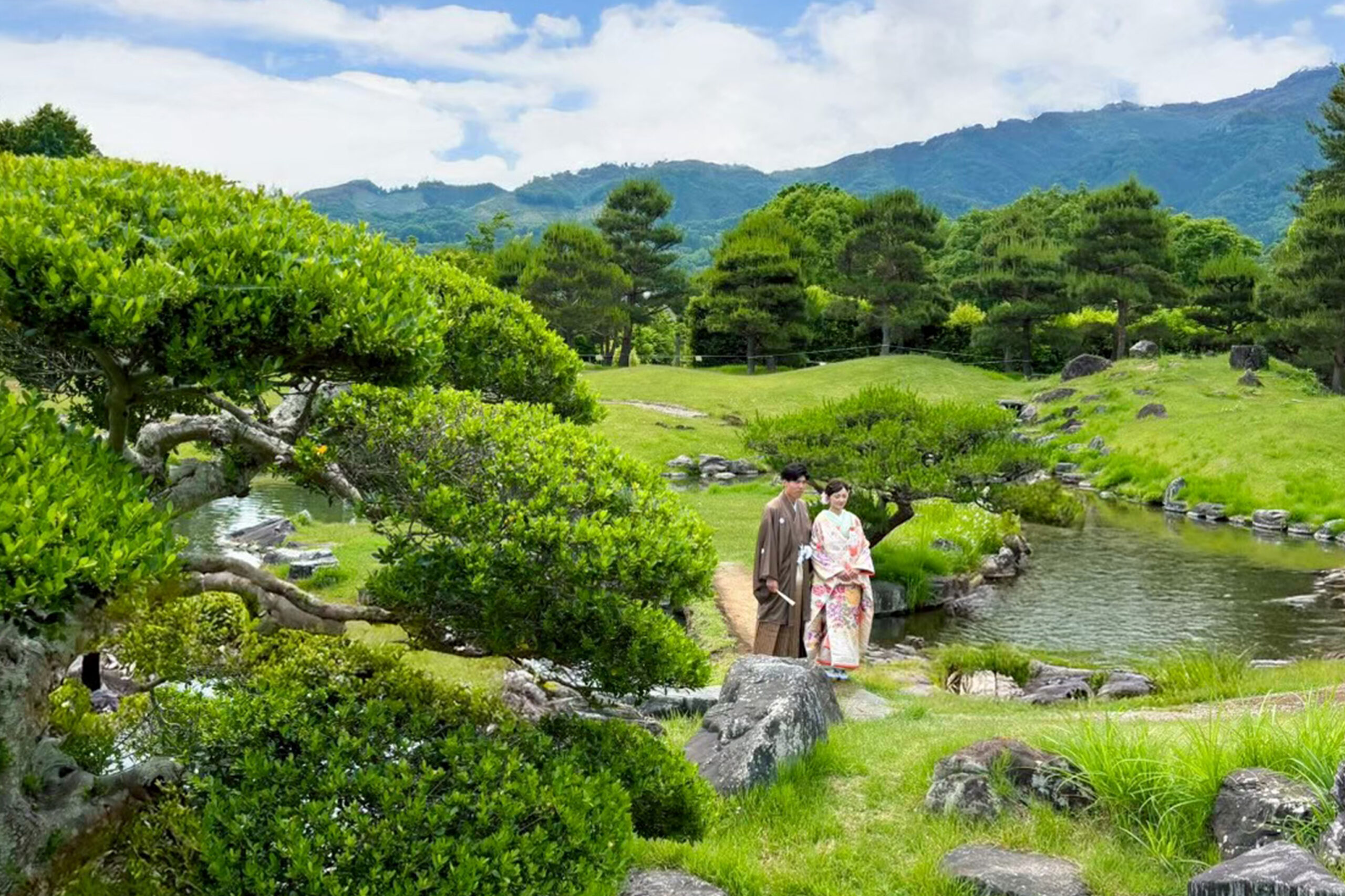 群馬県甘楽町に佇む「楽山園(らくさんえん)」は、江戸時代の風情を色濃く残す、国指定名勝の大名庭園。静けさに満ちた池泉回遊式の庭園と、美しく整えられた石畳、茶室、松の木々が織りなす景色は、まさに和の原風景。移ろいゆく季節とともに表情を変える庭園は、春の桜、夏の深緑、秋の紅葉、冬の静寂… どの季節も絵になります。白無垢や色打掛が映える、格式高いロケーションで、心に残る一枚を。