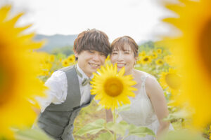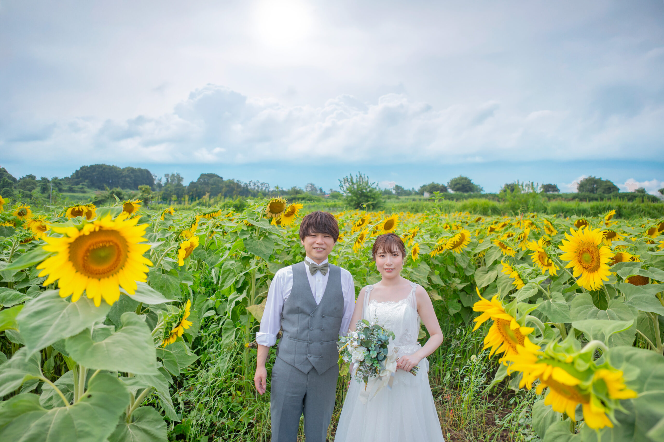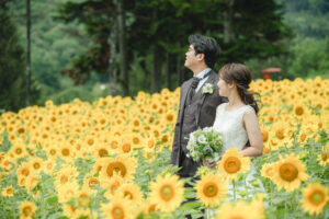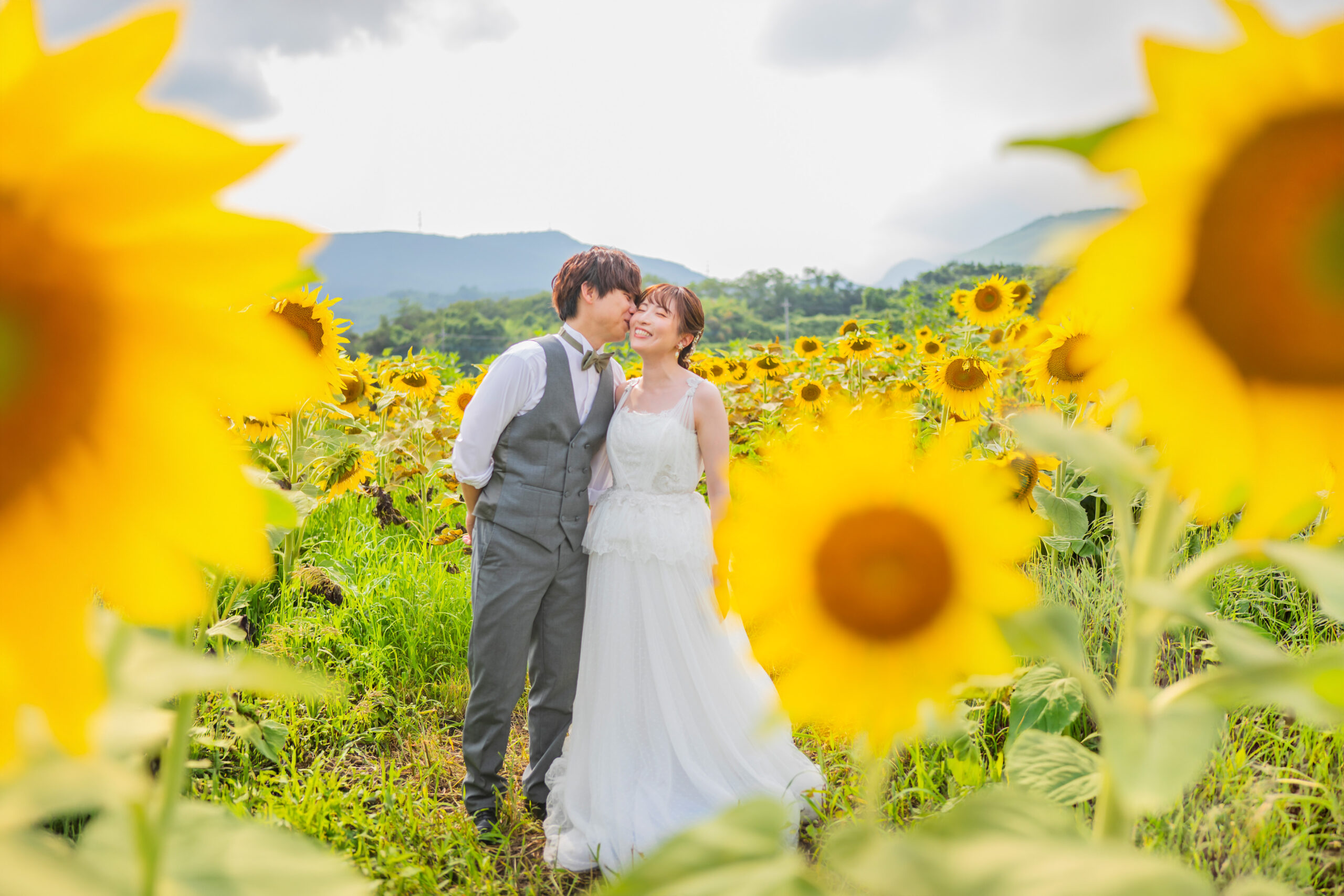 富岡の空に一番近い場所、「丹生の丘」。夏が来ると、そこには10万本ものひまわりが太陽を追いかけ、丘一面を黄金色に染め上げます。見渡す限りのイエロー、突き抜けるようなブルー、そしておふたりの笑顔。それは、まるで映画のラストシーンのような、世界で一番まぶしい光景です。飾らない、ありのままの幸せを、このひまわりの海に閉じ込めて。