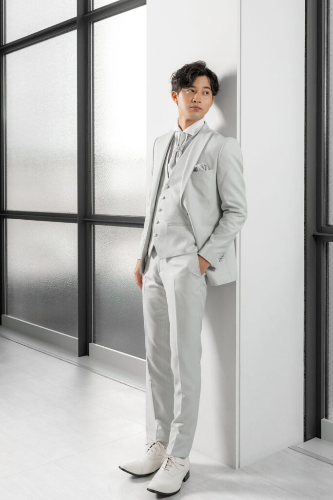 やわらかなライトグレーが印象的なタキシード。光の当たり方によってはライトグリーンにも見える絶妙なカラー。