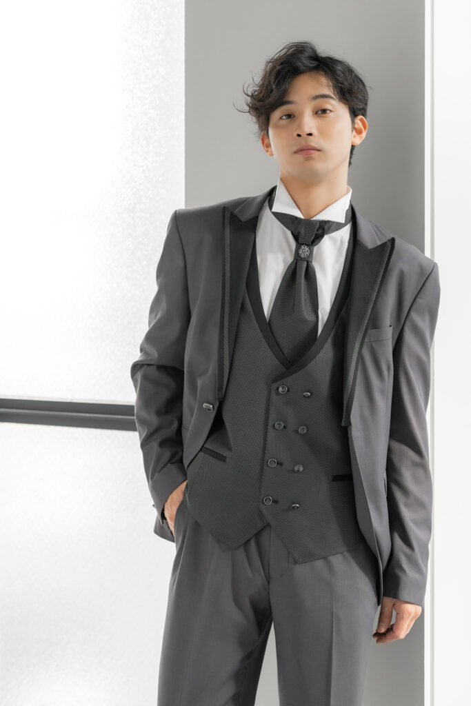 落ち着いたチャコールグレーが印象的なタキシード。