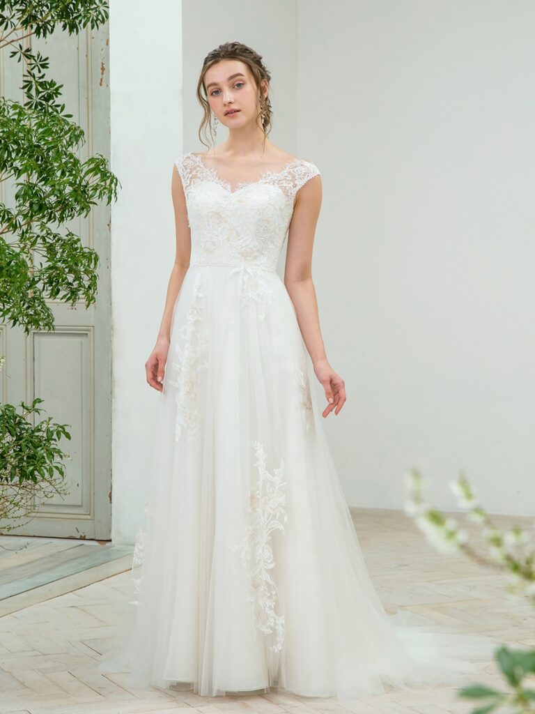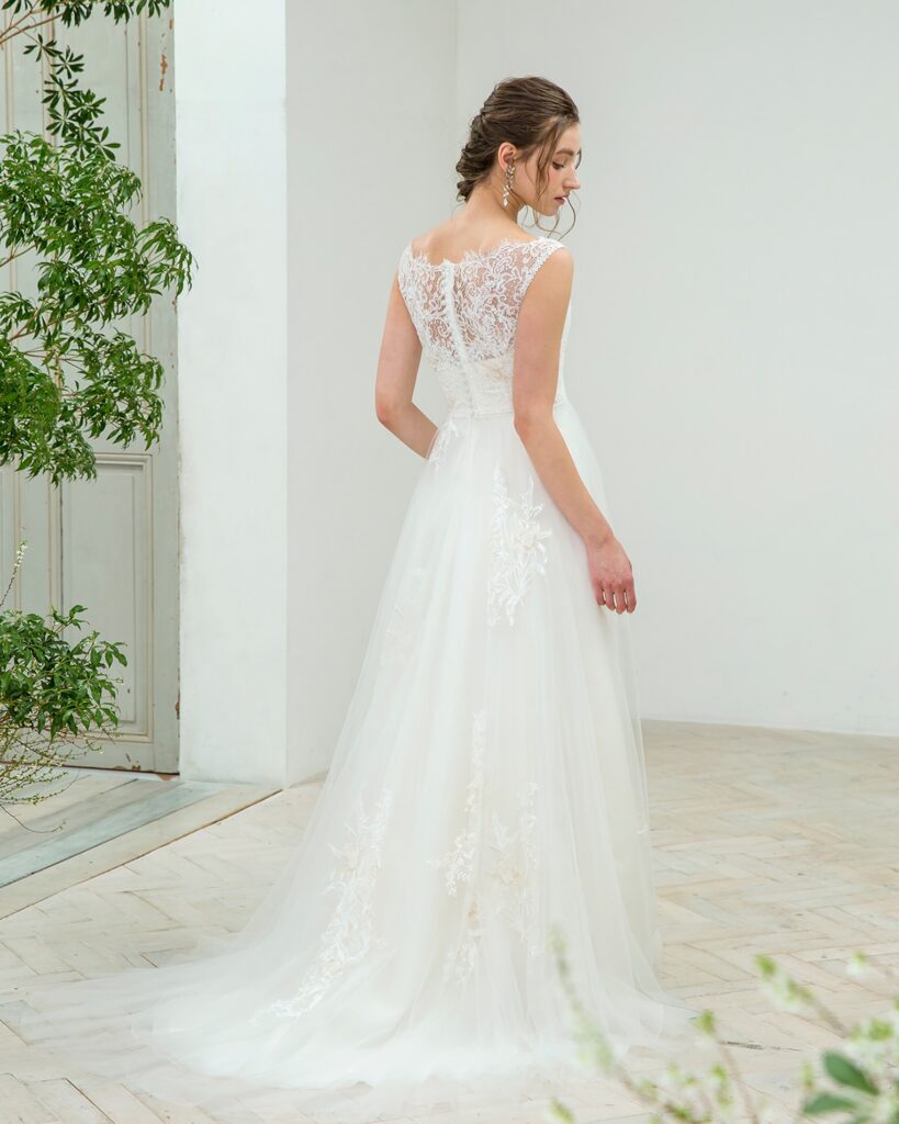 繊細なリバーレースと軽やかなチュールが溶け合う、清楚で優美なAラインドレス。胸元から背中にかけて広がるレースのスカラップが、女性らしい柔らかさを引き立てます。スカートには植物モチーフの刺繍を散りばめ、歩くたびに光がふわりと揺れるような透明感のある仕上がりに。シンプルすぎず甘すぎない、絶妙なナチュラルさが魅力の一着です。