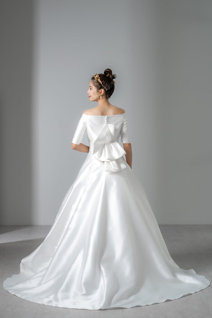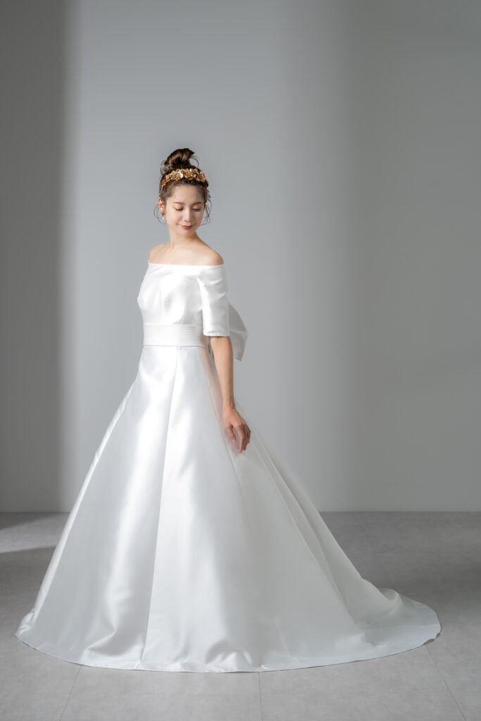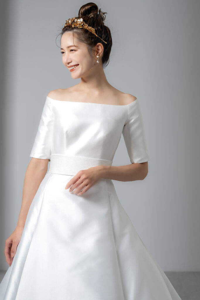 光沢の美しいサテンを贅沢に使用した、王道のAラインドレス。 デコルテを美しく見せるオフショルダーのハーフスリーブは、清楚でありながらどこかモダンな印象を醸し出します。