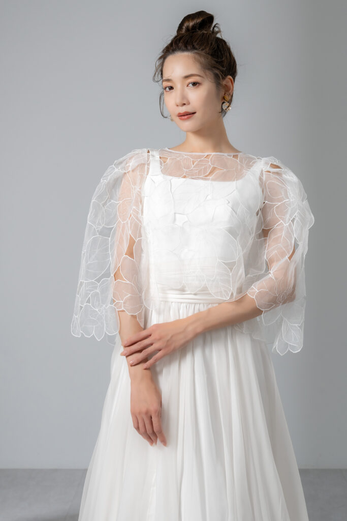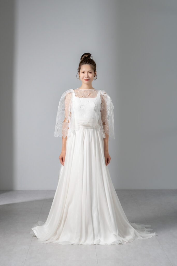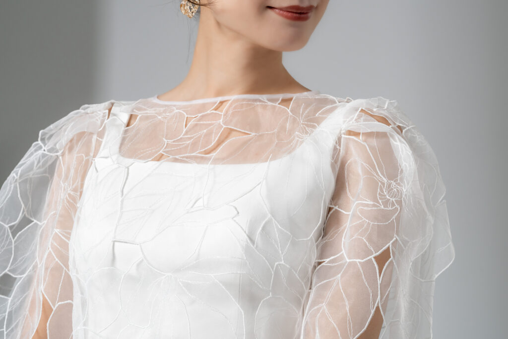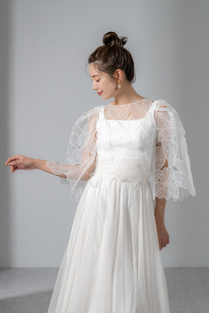 ボレロを纏えば、肩先を優しく覆うパフスリーブが可憐な印象を与え、バックスタイルまで繊細な刺繍が肌に浮かび上がるような幻想的な美しさを演出します。 一方、ボレロを外すと、潔くシンプルなスクエアネックのノースリーブスタイルに。ミニマルで都会的な表情へとガラリと印象を変えられます。