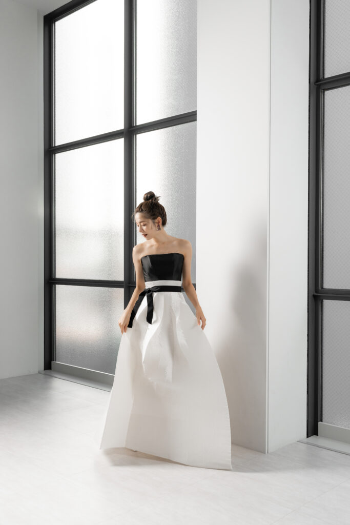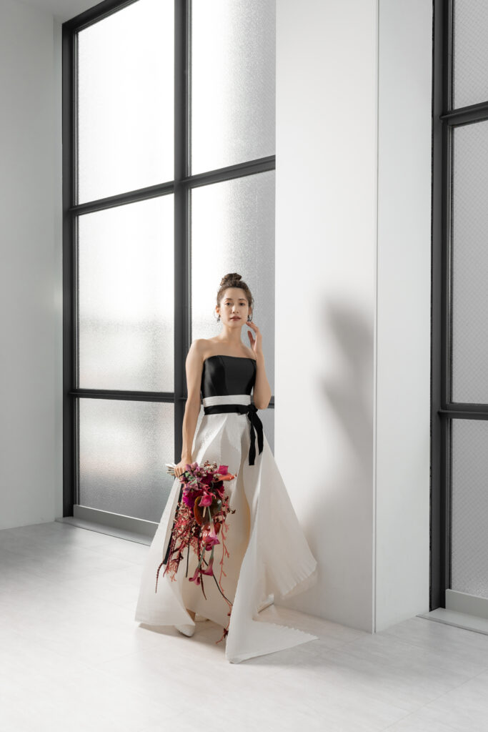 花嫁の美しさを多角的に引き出す、計算し尽くされたデザイン設計。 フロントからバックにかけて流れるようなラインは、360度どこから見ても隙のない完璧なシルエットを演出します。 凛とした強さと、女性らしいしなやかさ。その両方を、自分らしいバランスで纏いたい花嫁にふさわしいドレスです。