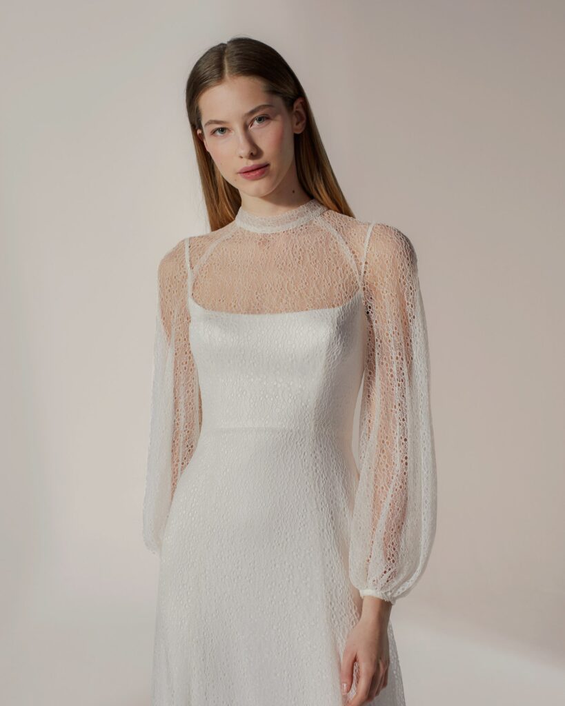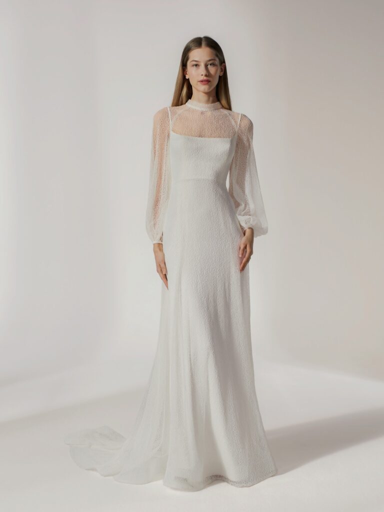 上品な光沢を放つスリッパーサテンのベースドレスに、繊細で透け感のあるオーバードレスを贅沢に重ねたレイヤードスタイル。 ベースとオーバーで敢えて異なるネックラインとシルエットを組み合わせることで、計算された美しいコントラストと、一言では言い表せない奥深い表情を生み出しています。