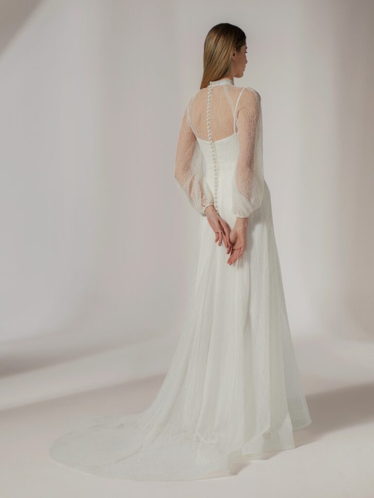 オーバードレスには、手仕事のぬくもりを感じさせる立体的なレブロデレース(コードレース)を惜しみなくあしらいました。 サテンの滑らかな質感と、浮かび上がるようなレースのコントラストが、花嫁の佇まいをよりいっそうドラマティックに、そして洗練された印象へと導きます。