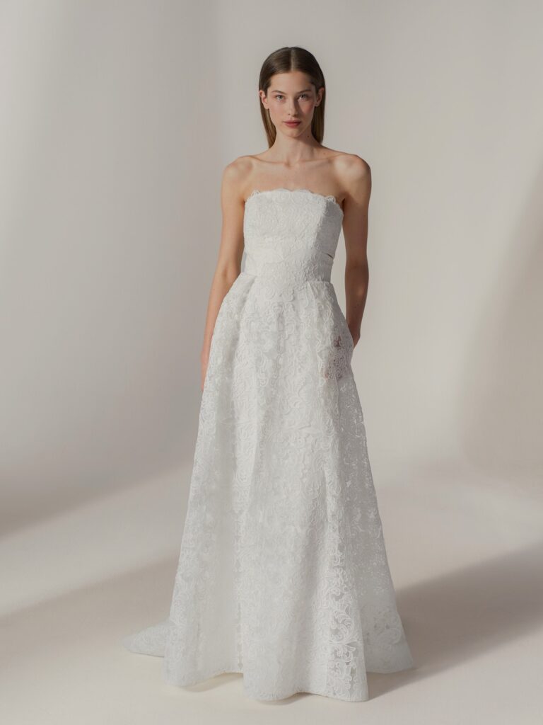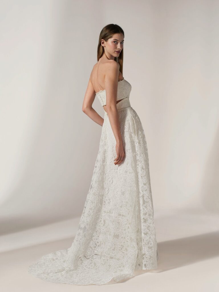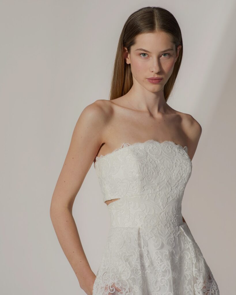 最大の魅力は、ウエストサイドを大胆にカットしたカットアウェイのデザイン。 総レースの可憐な印象を、サイドの肌見せが凛と引き締め、都会的でハイセンスな表情へと昇華させます。バックスタイルまで続く繊細なレースワークと、計算されたシルエットのバランスが、360度どこから見てもドラマティックな花嫁姿を叶えます。