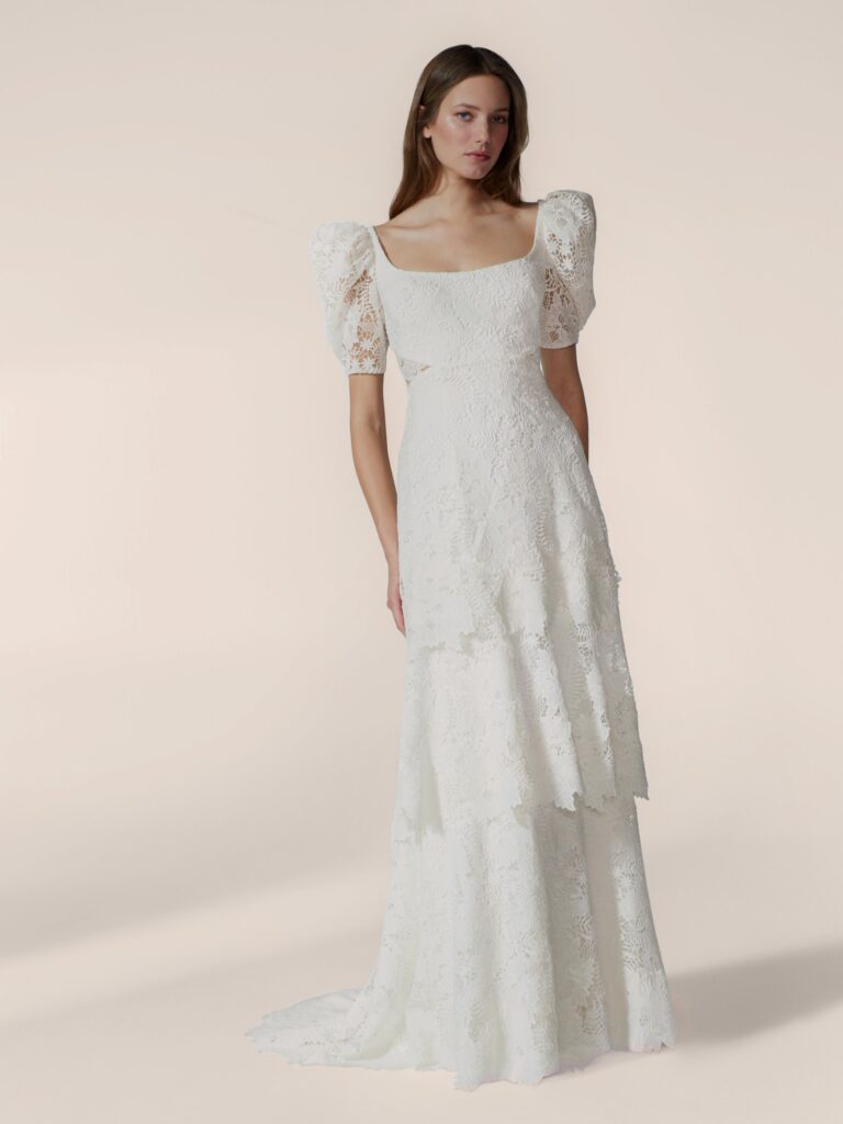 身頃からスカートにかけては、厚みのある贅沢なギピュールレースの刺繍を惜しみなく使用。 重なり合う三段のレイヤードスカートが、歩くたびに美しいリズムを奏で、圧倒的な存在感を放ちます。デコルテを美しく見せるスクエアネックには、絶妙な透け感のアクセントを効かせており、重厚感のある素材の中に現代的な抜け感をプラスしています。