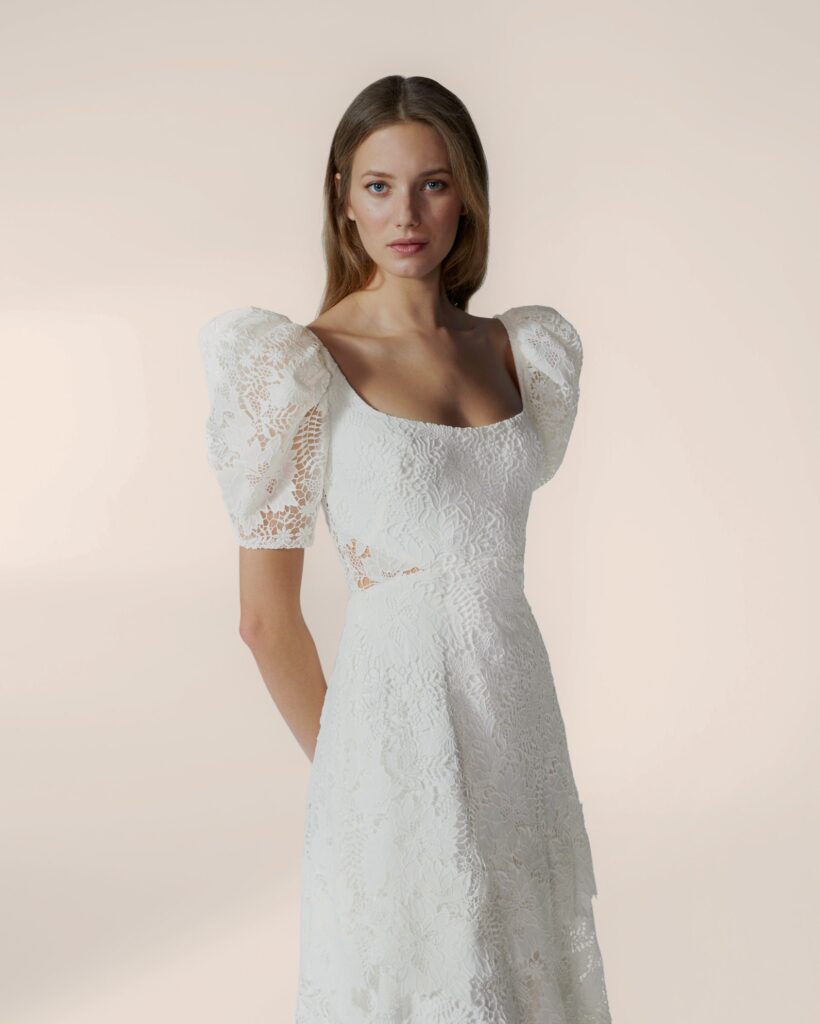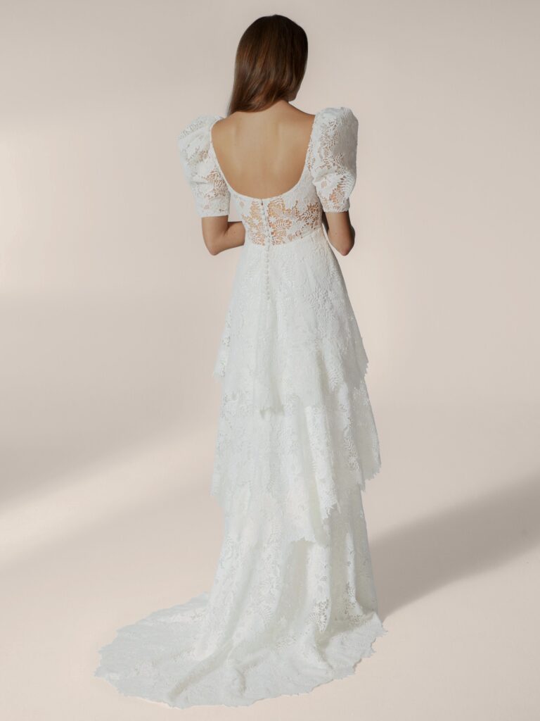 どこかノスタルジックで、見る人を一瞬で引きつける主役級のティアードドレス。肩から肘にかけてふんわりと膨らみ、手首に向かって細くなるボリュームのある袖が、お顔周りを華やかに見せ、気高くも優美なシルエットを描き出します。