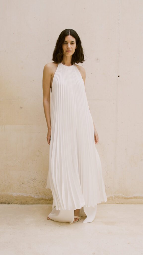 細やかなプリーツ加工が全身に施された、ミニマルかつモードなスレンダードレス。 最大の特徴は、首元から流れるように広がる計算されたシルエット。歩くたびにプリーツが空気を孕んでしなやかに揺れ動く様は、どんな豪華な装飾よりもドラマティックで、ゲストの視線を釘付けにします。