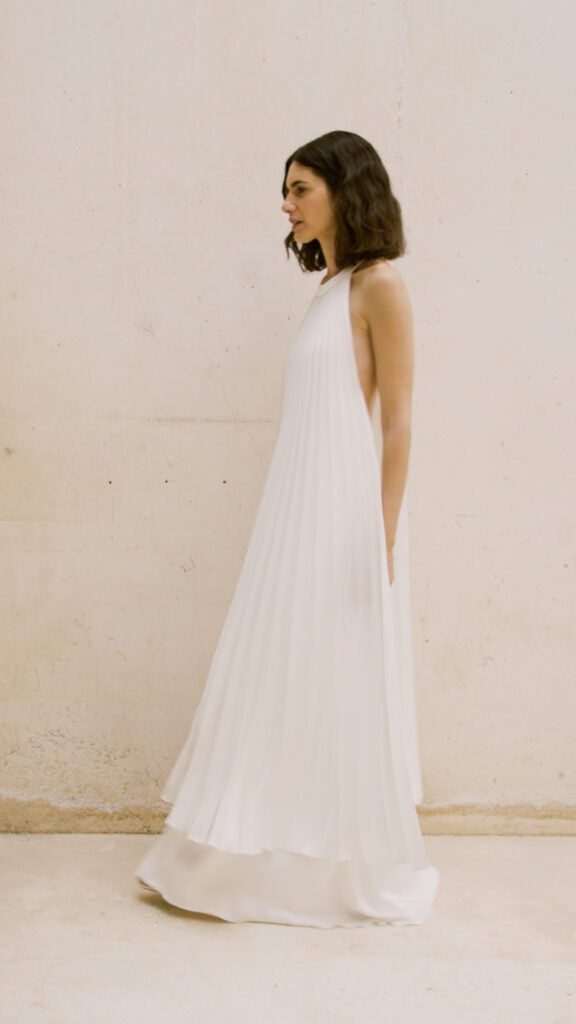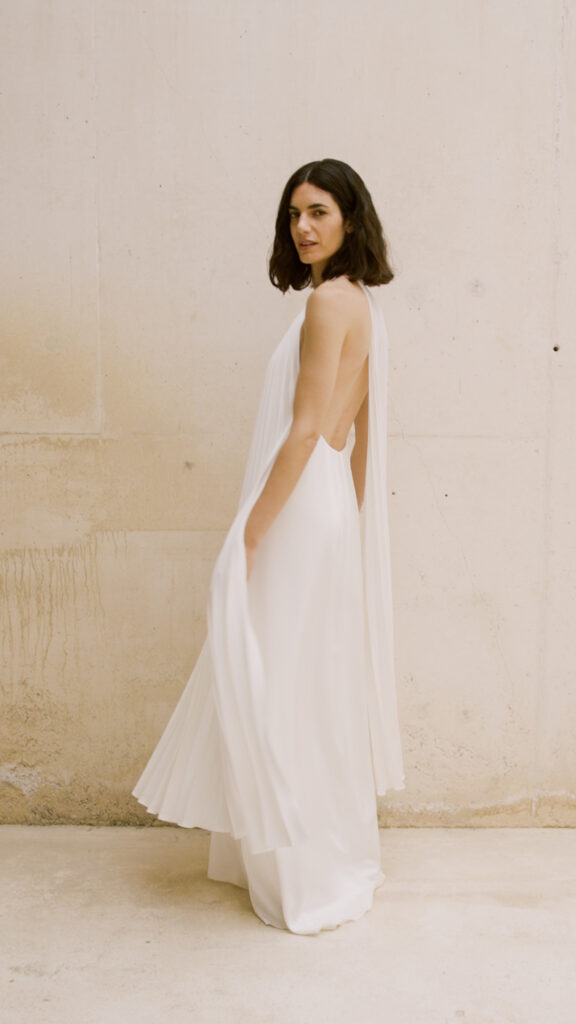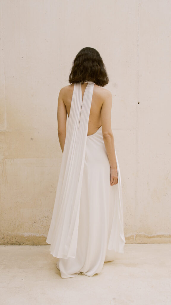 潔く開いたバックスタイルとホルターネックの組み合わせは、女性らしい肩のラインや背中の美しさをヘルシーに強調。 重なり合うプリーツが縦のラインを強調してくれるため、スタイルアップ効果も抜群です。装飾を削ぎ落としたからこそ際立つ「素材の良さ」と「シルエットの美しさ」が、感度の高い大人の花嫁にふさわしい一着です。