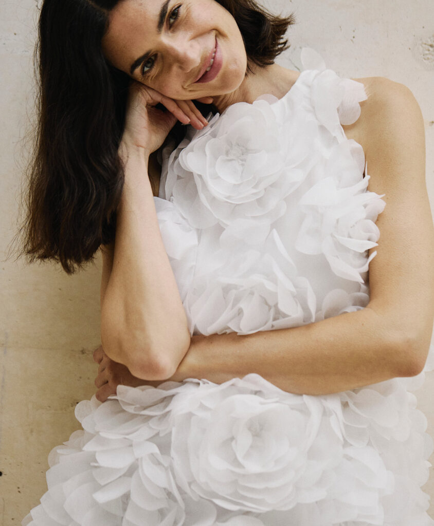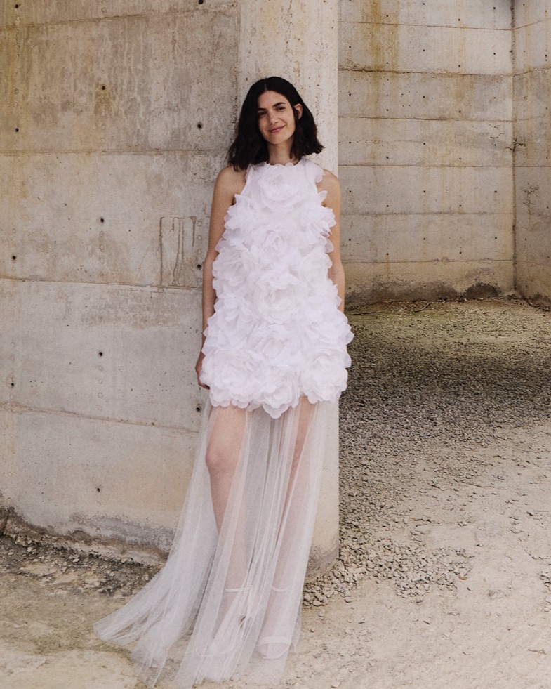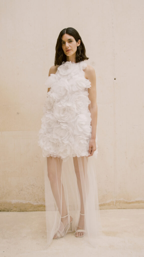 立体的な3Dフラワー刺繍を贅沢にあしらったミニドレスに、柔らかなチュールのマキシスカートを重ねた、自由でファッショナブルな2ピース・スタイル。