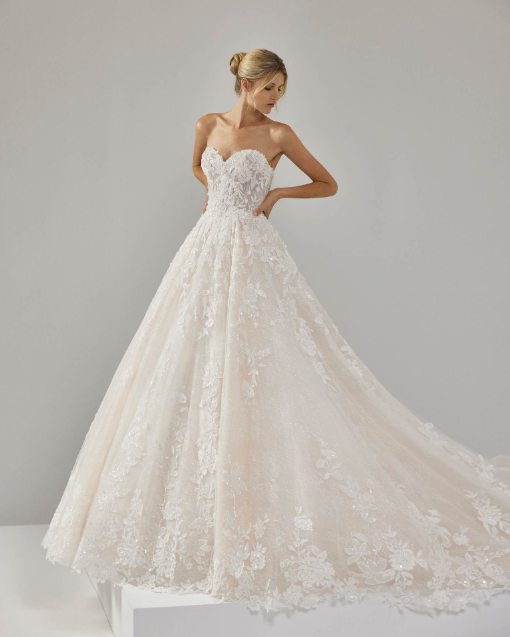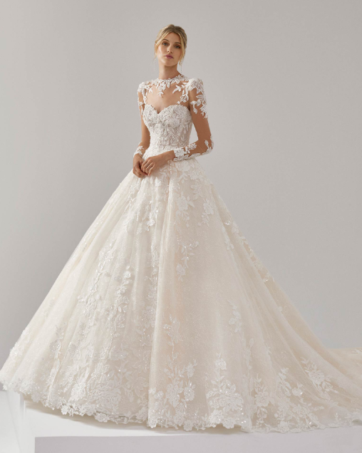 ハートシェイプのビスチェラインが女性らしさを引き立て、計算されたボリュームのスカートが圧倒的なヒロイン感を演出します。さらに、繊細なイリュージョンレースのロングスリーブブラウスを合わせることで、クラシカルで気品に満ちた表情へとチェンジ。動くたびにドレス全体が宝石のように輝き、特別な一日にふさわしい、最高に華やかでドラマティックな佇まいを叶えます。