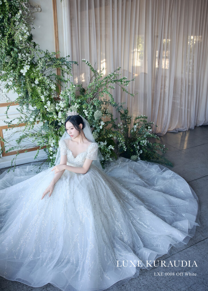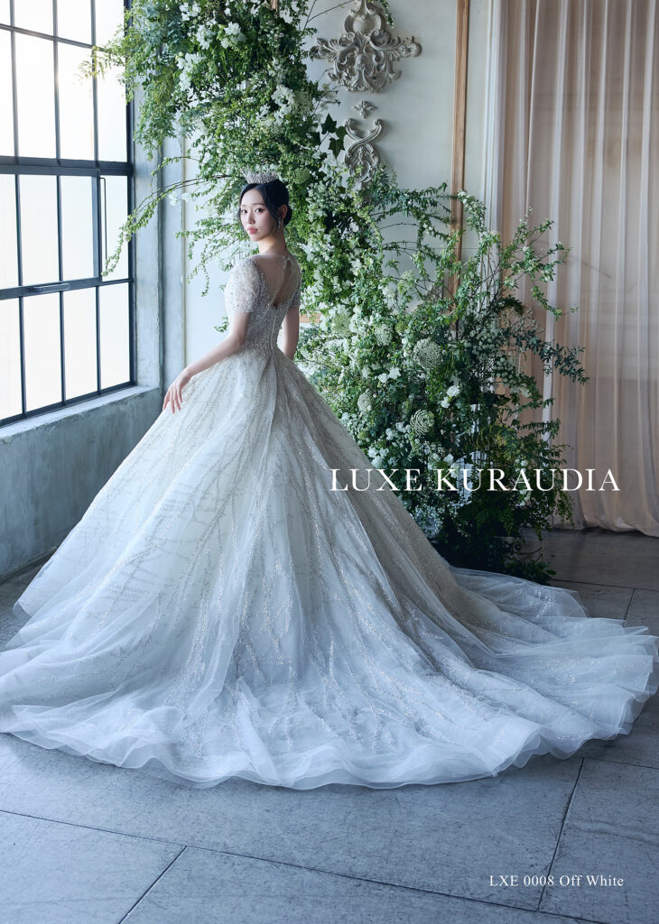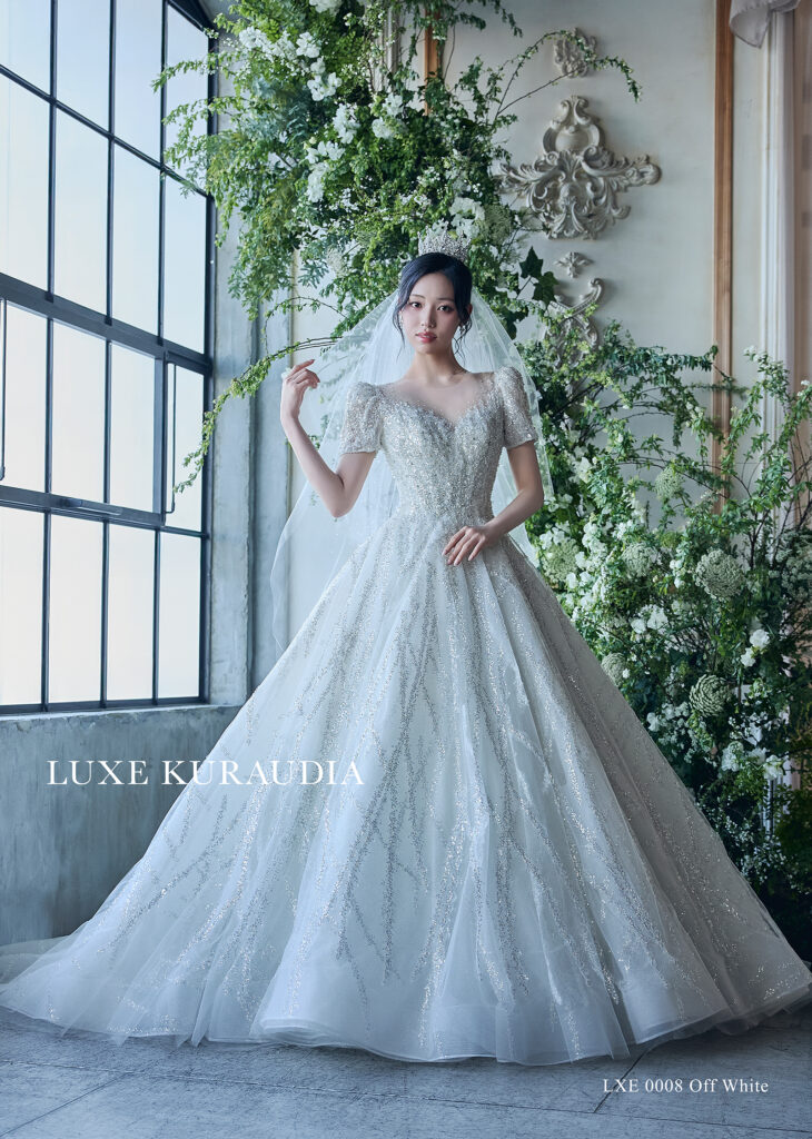 透き通るようなチュールに、流れるようなラインを描く贅沢なグリッターを全身に施した、圧倒的な輝きを放つプリンセススタイル。胸元から裾にかけて、まるで光のシャワーを浴びているかのような繊細なグリッターが立体的に広がり、花嫁様をドラマティックに包み込みます。 デコルテを美しく見せるハートシェイプのネックラインと、柔らかなパフスリーブの組み合わせが、高貴な印象を与えつつ、女性らしいしなやかな甘さを演出。「都会的な華やかさ」を大切にしながら、動くたびに360度どこから見ても眩い光を放ち、主役にふさわしいオーラあふれる佇まいを叶えます。