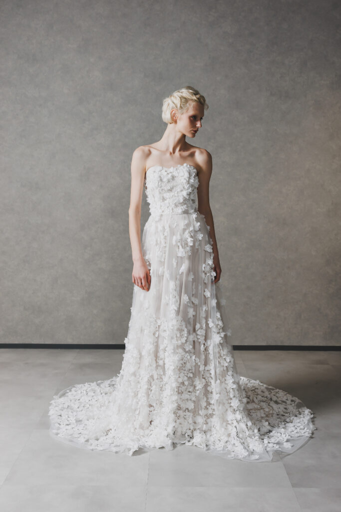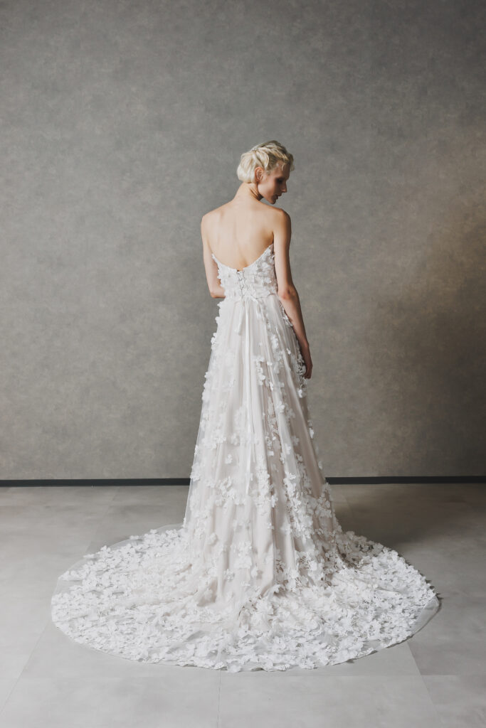 ○甘すぎないフェミニンさを重視し、3Dフラワーのディテールで上品な華やかさをプラスしたい花嫁様