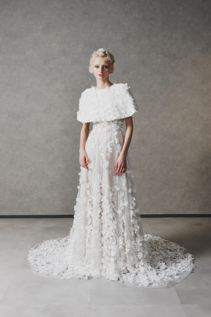 軽やかなチュール素材に、咲き誇るような3Dフラワーモチーフを贅沢に散りばめた、ピュアで愛らしいスレンダースタイル。ベースの淡いベージュカラーが洒落感を惹き立て、胸元からスカートの裾にかけて、風に舞う花びらのような立体的な刺繍が表情豊かに広がり、花嫁様を優しく包み込みます。 すっきりとしたビスチェラインと、繊細な花々を施したセットのケープを組み合わせることで、デコルテを華やかに見せつつ女性らしい柔らかな雰囲気を演出。動くたびに3D刺繍が軽やかに揺れ、「ナチュラルな美しさ」を大切にしながら、特別な一日にふさわしい幸福感あふれる佇まいを叶えます。