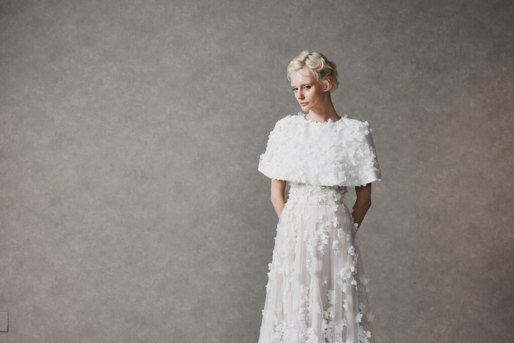 ○セットのケープを取り入れ、お顔周りを華やかに見せつつ肩周りを優しくカバーしたい花嫁様