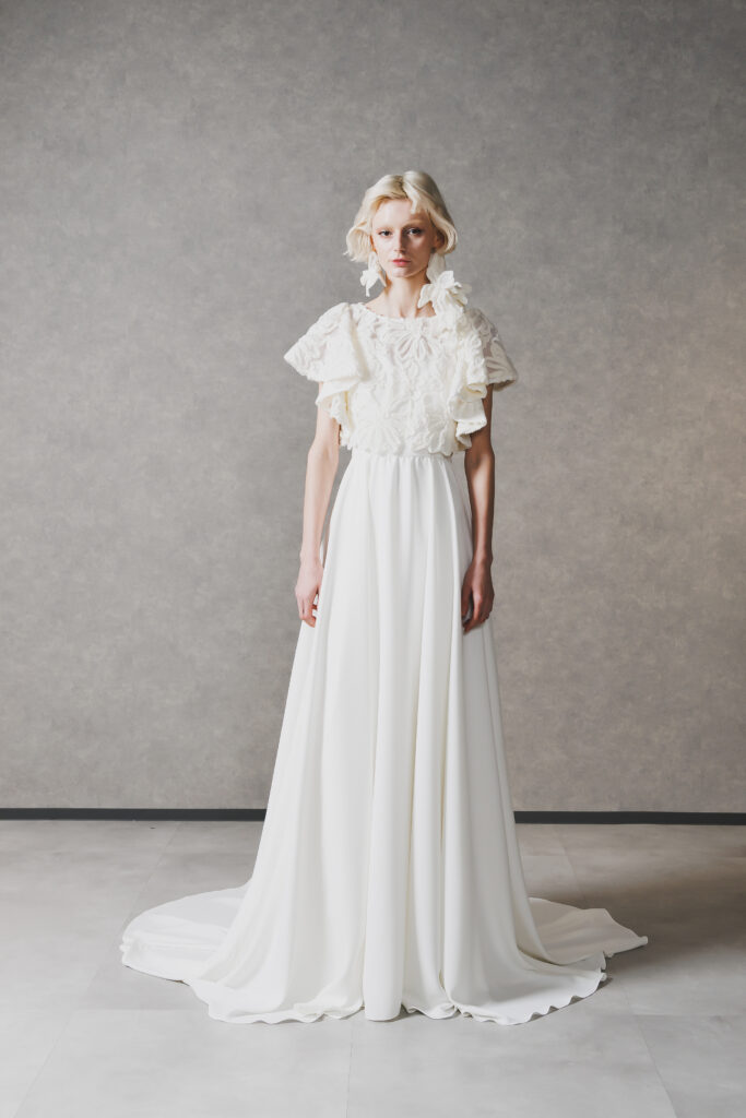 柔らかな落ち感のあるシフォン生地が、動くたびにしなやかな余韻を残す、洗練されたスレンダーラインのウェディングドレス。上半身に施された大ぶりの立体的なフラワーモチーフが、お顔周りを華やかかつドラマチックに彩ります。