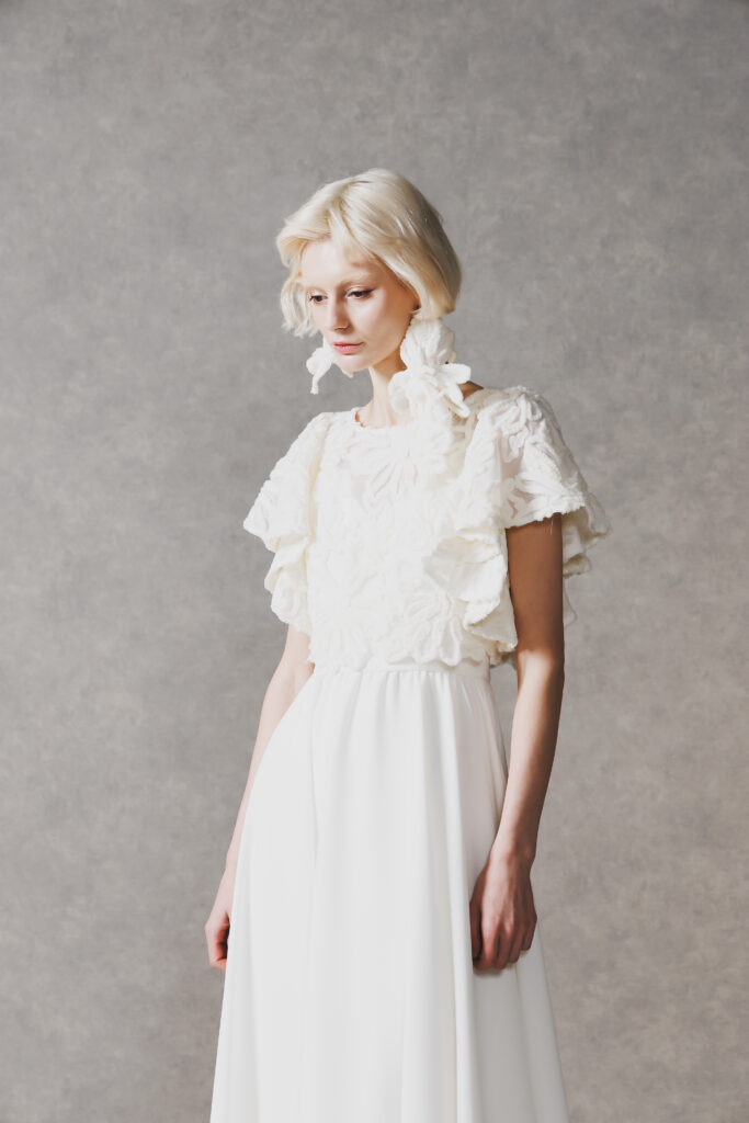 肩から二の腕にかけてふんわりと流れるようなフリルスリーブ。腕周りを優しくカバーしながらも、シアーな素材感が軽やかな抜け感を演出し、クラシックさとモダンな感性が共存する一着に仕上げました。